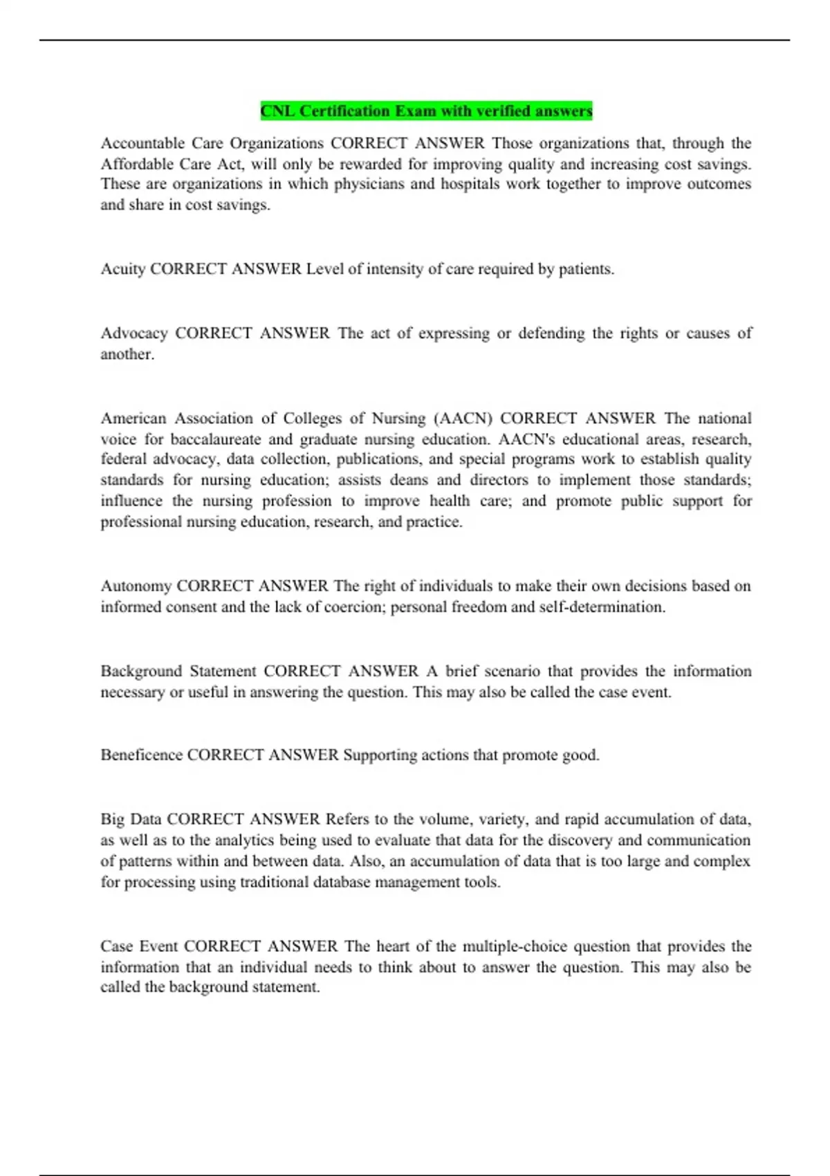 Accountable Care Organizations CORRECT ANSWER Those organizations that, through the Affordable Care Act, will only be rewarded for improving quality and increasing cost savings. These are organizations in which physicians and hospitals work together to improve outcomes and share in cost savings. Acuity CORRECT ANSWER Level of intensity of care required by patients. Advocacy CORRECT ANSWER The act of expressing or defending the rights or causes of another. American Association of Colleges of Nursing (AACN) CORRECT ANSWER The national voice for baccalaureate and graduate nursing education. AACN's educational areas, research, federal advocacy, data collection, publications, and special programs work to establish quality standards for nursing education; assists deans and directors to implement those standards; influence the nursing profession to improve health care; and promote public support for professional nursing education, research, and practice. Autonomy CORRECT ANSWER The right of individuals to make their own decisions based on informed consent and the lack of coercion; personal freedom and self-determination.
