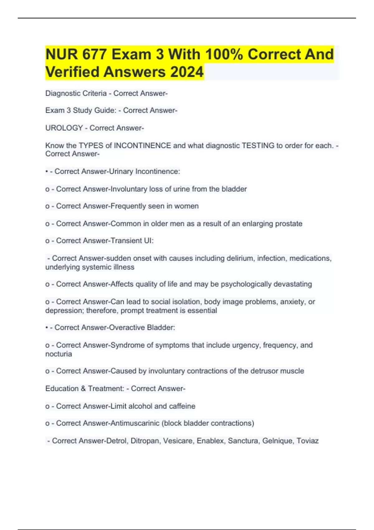 NUR 677 Exam 3 With 100% Correct And Verified Answers 2024 Diagnostic Criteria - Correct Answer- Exam 3 Study Guide: - Correct Answer- UROLOGY - Correct Answer- Know the TYPES of INCONTINENCE and what diagnostic TESTING to order for each. - Correct Answer- • - Correct Answer-Urinary Incontinence: o - Correct Answer-Involuntary loss of urine from the bladder o - Correct Answer-Frequently seen in women o - Correct Answer-Common in older men as a result of an enlarging prostate o - Correct Answer-Transient UI: - Correct Answer-sudden onset with causes including delirium, infection, medications, underlying systemic illness o - Correct Answer-Affects quality of life and may be psychologically devastating o - Correct Answer-Can lead to social isolation, body image problems, anxiety, or depression; therefore, prompt treatment is essential • - Correct Answer-Overactive Bladder: o - Correct Answer-Syndrome of symptoms that include urgency, frequency, and nocturia o - Correct Answer-Caused by involuntary contractions of the detrusor muscle Education & Treatment: - Correct Answer- o - Correct Answer-Limit alcohol and caffeine o - Correct Answer-Antimuscarinic (block bladder contractions) - Correct Answer-Detrol, Ditropan, Vesicare, Enablex, Sanctura, Gelnique, Toviaz - Correct Answer-Don't use if they have: • - Correct Answer-Glaucoma, Myasthenia gravis, Gastric obstruction, Colitis, Urinary Retention, Gastric retention o - Correct Answer-Tricyclic Antidepressants - Correct Answer-Elavil, Tofranil • - Correct Answer-STRESS Incontinence: "Increased Intra-abdominal Pressure" o - Correct Answer-Incontinence from coughing, sneezing, and laughing which increase intra-abdominal pressure o - Correct Answer-Bladder is unable to retain urine due to: - Correct Answer-Hypermobility of the bladder neck - Correct Answer-Intrinsic sphincter deficiency - Correct Answer-Neurogenic sphincter deficiency - Correct Answer-Medications: sedatives, hypnotics, alpha blockers, and/or antispasmodics o - Correct Answer-Patients report urine leakage with coughing or sneezing and typically have a history of vaginal deliveries and/or hysterectomy Diagnostics: - Correct Answer- o - Correct Answer-Pelvic exam o - Correct Answer-Pad test to determine the amount and frequency of leakage o - Correct Answer-Cough stress test o - Correct Answer-Urinalysis with culture and sensitivity o - Correct Answer-Video-urodynamics and/or cystometrogram Education & Treatment: - Correct Answer- o - Correct Answer-Kegel exercises o - Correct Answer-Weight loss (if obese) o - Correct Answer-Eliminate diuretics o - Correct Answer-Antimuscarinic (block bladder contractions) - Correct Answer-Detrol, Ditropan, Vesicare, Enablex, Sanctura, Gelnique, Toviaz - Correct Answer-Don't use if they have: • - Correct Answer-Glaucoma, Myasthenia gravis, Gastric obstruction, Colitis, Urinary Retention, Gastric retention o - Correct Answer-Topical Estrogen - Correct Answer-Premarin cream, Estrace cream, Estring - Correct Answer-Don't use if they have: • - Correct Answer-Breast CA, Thromboembolic disorders, Pregnancy • - Correct Answer-URGE Incontinence: "detrusor instability" o - Correct Answer-Involuntary leakage of urine from inability to delay voiding Causes: - Correct Answer- o - Correct Answer-UTI, vaginitis, bladder stones, bladder tumors o - Correct Answer-Cortical, subcortical, and suprasacral lesions o - Correct Answer-CVA, dementia, multiple sclerosis, Parkinson's disease o - Correct Answer-Prostate problems; spinal cord transection o - Correct Answer-Medications: diuretics and narcotics Signs/ Symptoms: - Correct Answer- o - Correct Answer-Dysuria, increased frequency/urgency, hematuria, large amounts of urine loss, and unstable detrusor muscle with decreased capacity, or nocturia Assessment: - Correct Answer- o - Correct Answer-Vaginal discharge smear o - Correct Answer-Neurological exam including an assessment of mental status