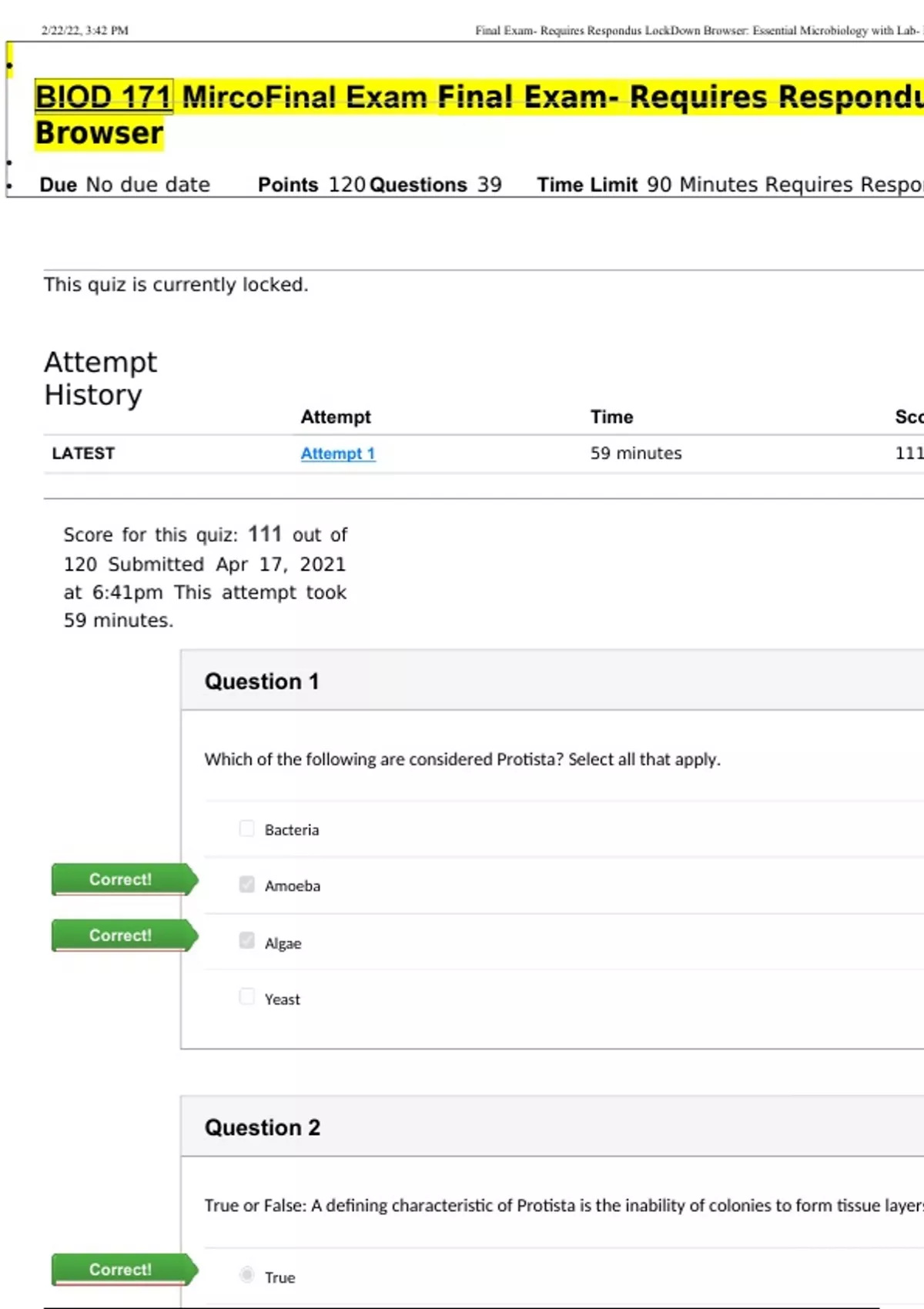 • BIOD 171 MircoFinal Exam Final Exam- Requires Respondus LockDown Browser