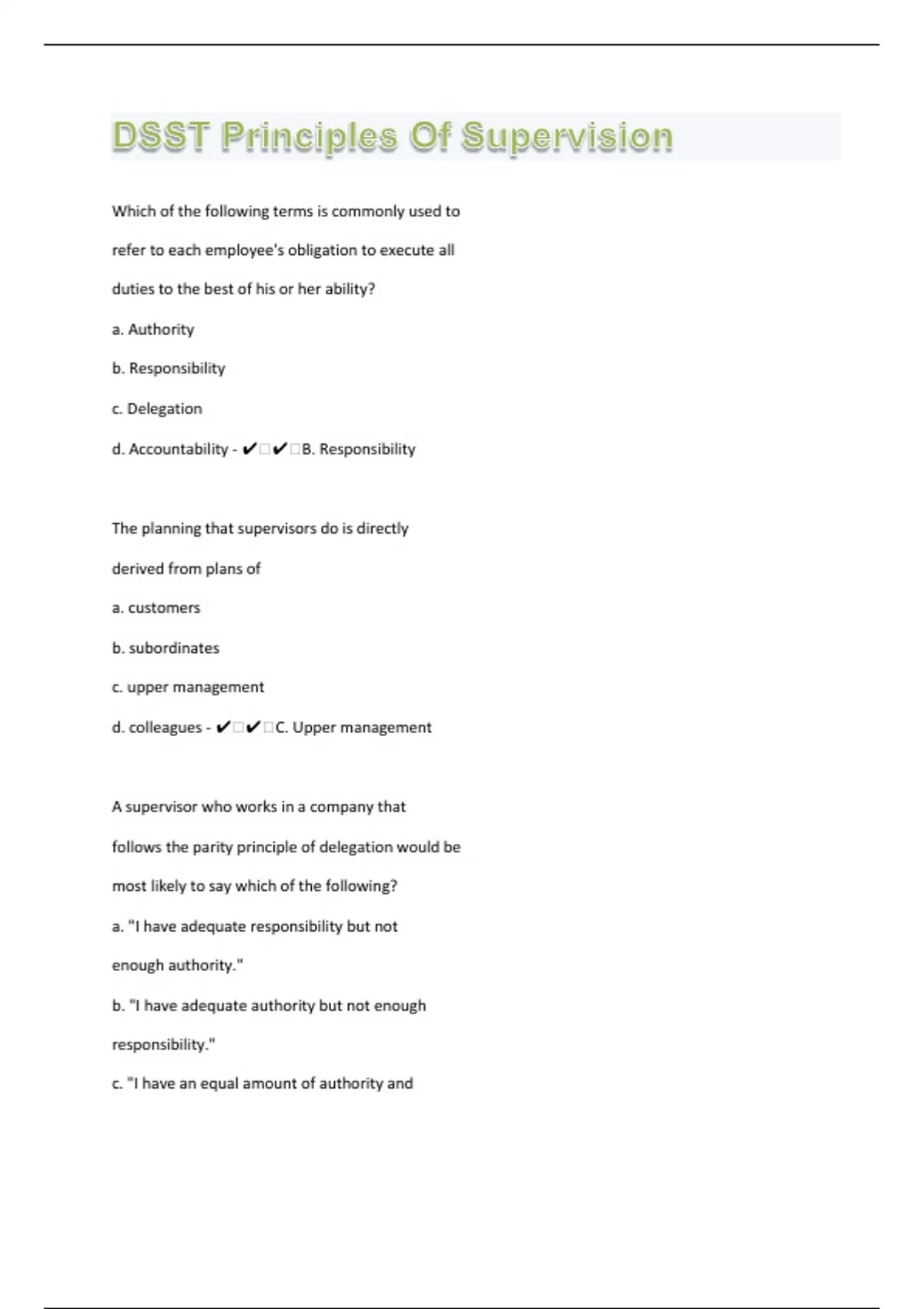 Which of the following terms is commonly used to refer to each employee's obligation to execute all duties to the best of his or her ability? a. Authority b. Responsibility c. Delegation d. Accountability - ️️B. Responsibility The planning that supervisors do is directly derived from plans of a. customers b. subordinates c. upper management d. colleagues - ️️C. Upper management A supervisor who works in a company that follows the parity principle of delegation would be most likely to say which of the following? a. "I have adequate responsibility but not enough authority." b. "I have adequate authority but not enough responsibility." c. "I have an equal amount of authority and