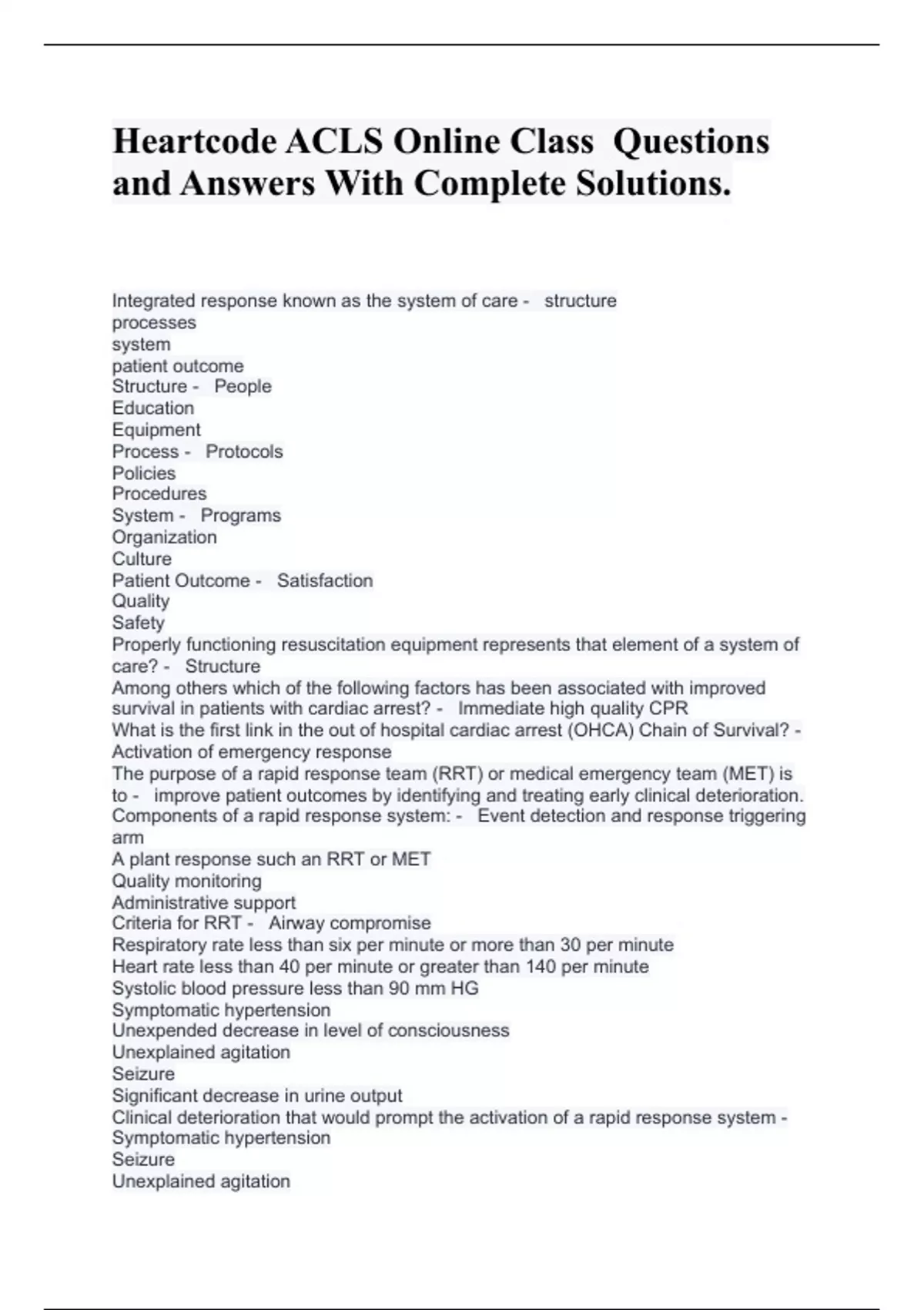Heartcode ACLS Online Class Questions and Answers With Complete Solutions. Integrated response known as the system of care - structure processes system patient outcome Structure - People Education Equipment Process - Protocols Policies Procedures System - Programs Organization Culture Patient Outcome - Satisfaction Quality Safety Properly functioning resuscitation equipment represents that element of a system of care? - Structure Among others which of the following factors has been associated with improved survival in patients with cardiac arrest? - Immediate high quality CPR What is the first link in the out of hospital cardiac arrest (OHCA) Chain of Survival? - Activation of emergency response The purpose of a rapid response team (RRT) or medical emergency team (MET) is to - improve patient outcomes by identifying and treating early clinical deterioration. Components of a rapid response system: - Event detection and response triggering arm A plant response such an RRT or MET Quality monitoring Administrative support Criteria for RRT - Airway compromise Respiratory rate less than six per minute or more than 30 per minute Heart rate less than 40 per minute or greater than 140 per minute Systolic blood pressure less than 90 mm HG Symptomatic hypertension Unexpended decrease in level of consciousness Unexplained agitation Seizure Significant decrease in urine output Clinical deterioration that would prompt the activation of a rapid response system - Symptomatic hypertension Seizure Unexplained agitation IHCA - In hospital cardiac arrest Benefits of implementing a rapid response system - Decreased in hospital cardiac arrest IHCA Decreased ICU length of stay Decrease in total hospital length of stay Whenever compressions are paused - Compressor should hover over the chest (not touching it) and be prepared for his integration Before passing compressions - 15 seconds before passing through fashion at the end of each two minute cycle high-performance teams should check for a pulse, recharge the defibrillator, if he supposed to deliver a shock in 10 seconds or less Switch compressors every - Switching between cycles every two minutes is best Real time feedback devices - His best practice to use real time feedback devices during CPR such as a metronome, or metronome app on your mobile device Which component of effective high-performance teams is represented by the use of real time feedback Devices? - Quality Main advantage of effective teamwork? - Division of tasks CPR Coach - Supports performance of high-quality BLS skills allowing the team leader to focus on other aspects of clinical care Which is the best example of a role of the team leader - Excellent team behavior What is the best example of a role of a team member? - Prepared to fulfill their role responsibilities What is the primary purpose of the CPR coach on a resuscitation team - Increasing CPR quality Which high-performance team member is part of the resuscitation triangle - Monitor/defibrillator/CPR Coach What is an example of summarizing and reevaluating - Increasing monitoring if the patient's condition deteriorates examples of mutual respect - Ensuring that only one person talks at a time Acknowledging correctly complete tasks in a positive way HIGH QUALITY CPR INCLUDES: - Compress the chest hard and fast at least 2 inches at a rate of 100 to 120 for a minute (30:2) Allow the chest you completely recoil after each compression Minimize interaction in compression (CHS compression fracture). Switch compressors about every two minutes or earlier if the tea. The switch should only take about five seconds Avoid excessive Ventilation Limit interactions for defibrillation or rhythm analysis to no longer than - 10 seconds Used bag mask device to - Give continuous chest compressions with asynchronous ventilation once every six seconds What defines chest compression fraction (ccf) - Actual chest compression time divided by total code time During CPR, chest compression fraction (CCF) should be at least % and ideally greater than %. - At least 60 Ideally Greater than 80