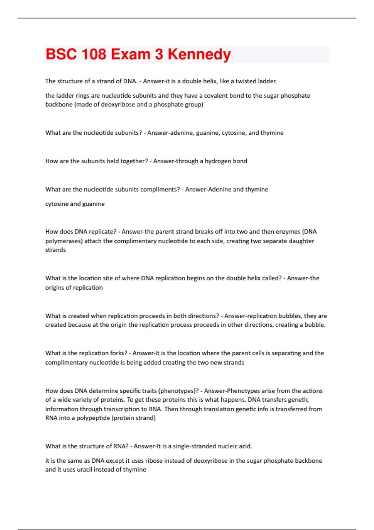 The structure of a strand of DNA. - Answer-it is a double helix, like a twisted ladder. the ladder rings are nucleotide subunits and they have a covalent bond to the sugar phosphate backbone (made of deoxyribose and a phosphate group) What are the nucleotide subunits? - Answer-adenine, guanine, cytosine, and thymine How are the subunits held together? - Answer-through a hydrogen bond What are the nucleotide subunits compliments? - Answer-Adenine and thymine cytosine and guanine How does DNA replicate? - Answer-the parent strand breaks off into two and then enzymes (DNA polymerases) attach the complimentary nucleotide to each side, creating two separate daughter strands What is the location site of where DNA replication begins on the double helix called? - Answer-the origins of replication What is created when replication proceeds in both directions? - Answer-replication bubbles, they are created because at the origin the replication process proceeds in other directions, creating a bubble. What is the replication forks? - Answer-It is the location where the parent cells is separating and the complimentary nucleotide is being added creating the two new strands How does DNA determine specific traits (phenotypes)? - Answer-Phenotypes arise from the actions of a wide variety of proteins. To get these proteins this is what happens. DNA transfers genetic information through transcription to RNA. Then through translation genetic info is transferred from RNA into a polypeptide (protein strand) What is the structure of RNA? - Answer-It is a single-stranded nucleic acid. it is the same as DNA except it uses ribose instead of deoxyribose in the sugar phosphate backbone and it uses uracil instead of thyminetRNA - Answer-transfer RNA: translation of the genetic message carried in the mRNA into the amino acid language of proteins (converts the three-letter words, codons, of nucleic acids to the amino acid words of proteins) What is the function of mRNA? - Answer-Messenger molecules carry the coding sequences for protein synthesis and are called transcripts.