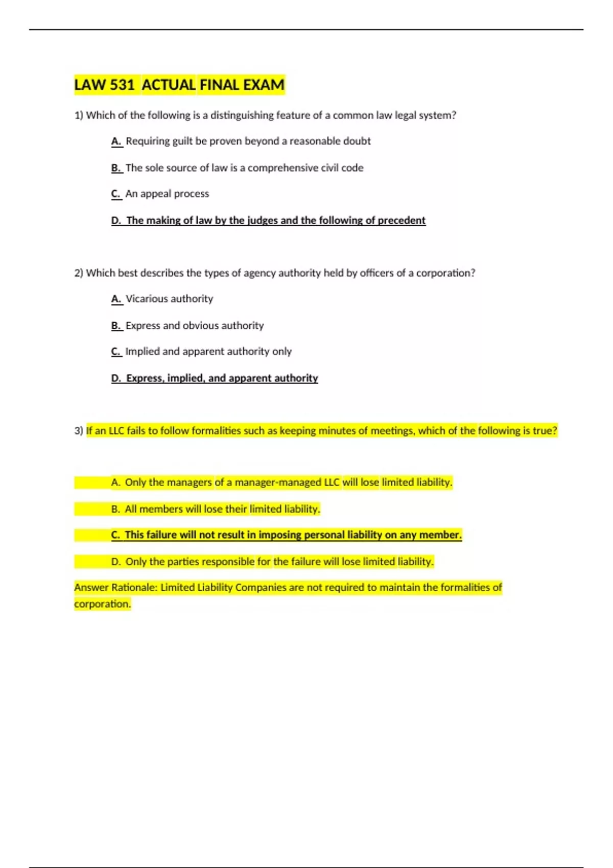 LAW 531 ACTUAL FINAL EXAM 1) Which of the following is a distinguishing feature of a common law legal system? A. Requiring guilt be proven beyond a reasonable doubt B. The sole source of law is a comprehensive civil code C. An appeal process D. The making of law by the judges and the following of precedent 2) Which best describes the types of agency authority held by officers of a corporation? A. Vicarious authority B. Express and obvious authority C. Implied and apparent authority only D. Express, implied, and apparent authority 3) If an LLC fails to follow formalities such as keeping minutes of meetings, which of the following is true? A. Only the managers of a manager-managed LLC will lose limited liability. B. All members will lose their limited liability. C. This failure will not result in imposing personal liability on any member. D. Only the parties responsible for the failure will lose limited liability. Answer Rationale: Limited Liability Companies are not required to maintain the formalities of corporation. 4) Martha started a flower shop as a sole proprietor. After 1 year, she was forced to close the shop because business was so bad. At that time, the business assets totaled $50,000, but the business liabilities totaled $125,000. Which of the following statements is true? A. Martha is personally liable for the additional $75,000. B. Martha’s business creditors can collect only the $50,000 of business assets. C. Martha’s business creditors can collect only the $50,000 now, but if Martha ever goes into business again, they can get the assets of the new business. D. Once Martha terminates the sole proprietorship, the business creditors cannot even get the $50,000. 5) Partners of a general partnership A. are protected from litigation against the partnership by statute B. are liable for the obligations of the partnership only to the extent of their capital contributions C. do not have to pay taxes on the profits of the partnership that are distributed to them D. are liable for all the obligations of their partnership 6) Which of the following forms of alternative dispute resolution allows both parties to see the strengths and weaknesses of both sides of the case through the presentation of evidence? A. Negotiated settlement B. Minitrial C. Mediation D. Conciliation Answer Rationale: Conciliation, mediation, and negotiated settlement do not involve the presentation of evidence.
