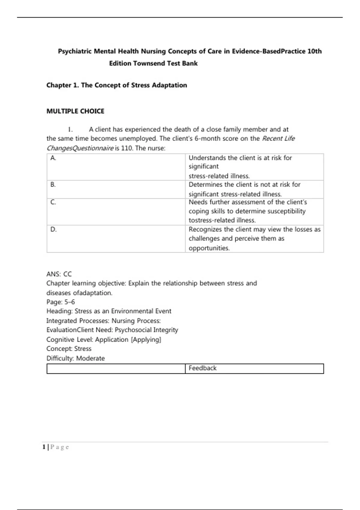 Test Bank Psychiatric Mental Health Nursing Concepts of Care in Evidence-BasedPractice 10th Edition Townsend