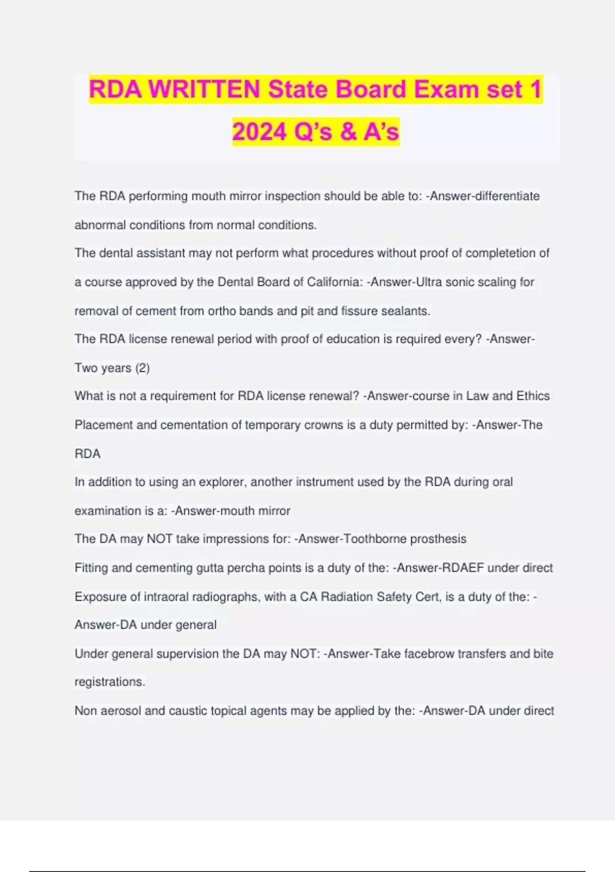 RDA WRITTEN State Board Exam set 1 2024 Q’s & A’s The RDA performing mouth mirror inspection should be able to: -Answer-differentiate abnormal conditions from normal conditions. The dental assistant may not perform what procedures without proof of completetion of a course approved by the Dental Board of California: -Answer-Ultra sonic scaling for removal of cement from ortho bands and pit and fissure sealants. The RDA license renewal period with proof of education is required every? -Answer- Two years (2) What is not a requirement for RDA license renewal? -Answer-course in Law and Ethics Placement and cementation of temporary crowns is a duty permitted by: -Answer-The RDA In addition to using an explorer, another instrument used by the RDA during oral examination is a: -Answer-mouth mirror The DA may NOT take impressions for: -Answer-Toothborne prosthesis Fitting and cementing gutta percha points is a duty of the: -Answer-RDAEF under direct Exposure of intraoral radiographs, with a CA Radiation Safety Cert, is a duty of the: - Answer-DA under general Under general supervision the DA may NOT: -Answer-Take facebrow transfers and bite registrations. Non aerosol and caustic topical agents may be applied by the: -Answer-DA under direct The RDA may NOT: -Answer-Adjust and cement permanent restorations. A duty NOT delegated to the Dental Sedation Assistant permit holder is: -Answer- Placement of intravenous lines. How many hours of CE are required by the RDA every two years, for licensure renewals: -Answer-25 hours A duty of the orthodontic assistant permit holder is: -Answer-*size orthodontic bands *cement ortho bands *place and ligate archwires A mother brings her child into the office when the dentist is not in. The child was last seen 18 months prior and now has a toothache and an obvious lrg cavity, you: -Answer- Perform a mouth mirror oral inspection and reschedule the patient. The administration of nitrous oxide is a duty of the: -Answer-Dentist ONLY What is not true in regards to "direct supervision": -Answer-The dentist must be present in the operatory during treatment The placement and removal of a rubber dam may be leagally performed by the: - Answer-DA / direct Placement of a temporary sedative dressing may be performed by the: -Answer-RDA All RDA's may: -Answer-perform all the duties of the DA Coronal polishing may be performed by: -Answer-RDA This is not an act in violation of the Dental Practice Act: -Answer-Failure to contact the patient at home after a surgical procedure Who shall be responsible for ensuring that the dental assistant maintains certification basic life support: -Answer-the dentist