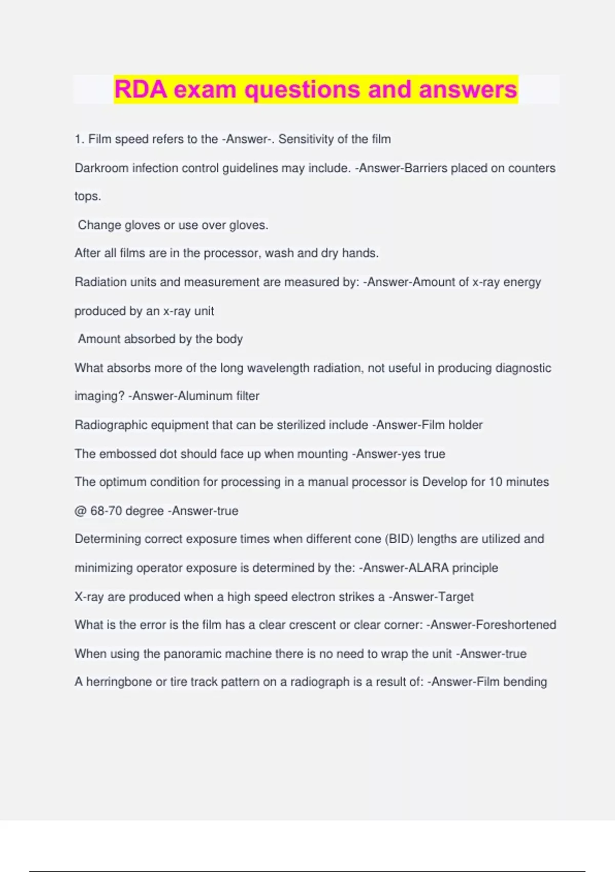 RDA exam questions and answers 1. Film speed refers to the -Answer-. Sensitivity of the film Darkroom infection control guidelines may include. -Answer-Barriers placed on counters tops. Change gloves or use over gloves. After all films are in the processor, wash and dry hands. Radiation units and measurement are measured by: -Answer-Amount of x-ray energy produced by an x-ray unit Amount absorbed by the body What absorbs more of the long wavelength radiation, not useful in producing diagnostic imaging? -Answer-Aluminum filter Radiographic equipment that can be sterilized include -Answer-Film holder The embossed dot should face up when mounting -Answer-yes true The optimum condition for processing in a manual processor is Develop for 10 minutes @ 68-70 degree -Answer-true Determining correct exposure times when different cone (BID) lengths are utilized and minimizing operator exposure is determined by the: -Answer-ALARA principle X-ray are produced when a high speed electron strikes a -Answer-Target What is the error is the film has a clear crescent or clear corner: -Answer-Foreshortened When using the panoramic machine there is no need to wrap the unit -Answer-true A herringbone or tire track pattern on a radiograph is a result of: -Answer-Film bending Whether using the manual or automatic processing techniques, improper handling can result in : -Answer-Films sticking together The varying shades of gray on a processed radiograph is termed: -Answer-Contrast The purpose of this film is to record a major portion of the maxilla or mandible on one film. -Answer-Occlusal ________________-is the time between exposure to radiation and the time the effect becomes visible -Answer-Latent period The two types of digital systems include: -Answer-Wired CCD and Wireless PSP Exposure to radiation can best be reduced for patient by? -Answer-Use of F speed film Using the "F" speed film can reduce the radiation exposure to the patient by: -Answer- 50% Anatomical structures that appear dark gray to black on a processed radiograph are described as being: -Answer-Radiolucent Solution exposure to air and light with the manual processing technique can be avoided by using a : -Answer-Tank cover Time temperature processing means the -Answe