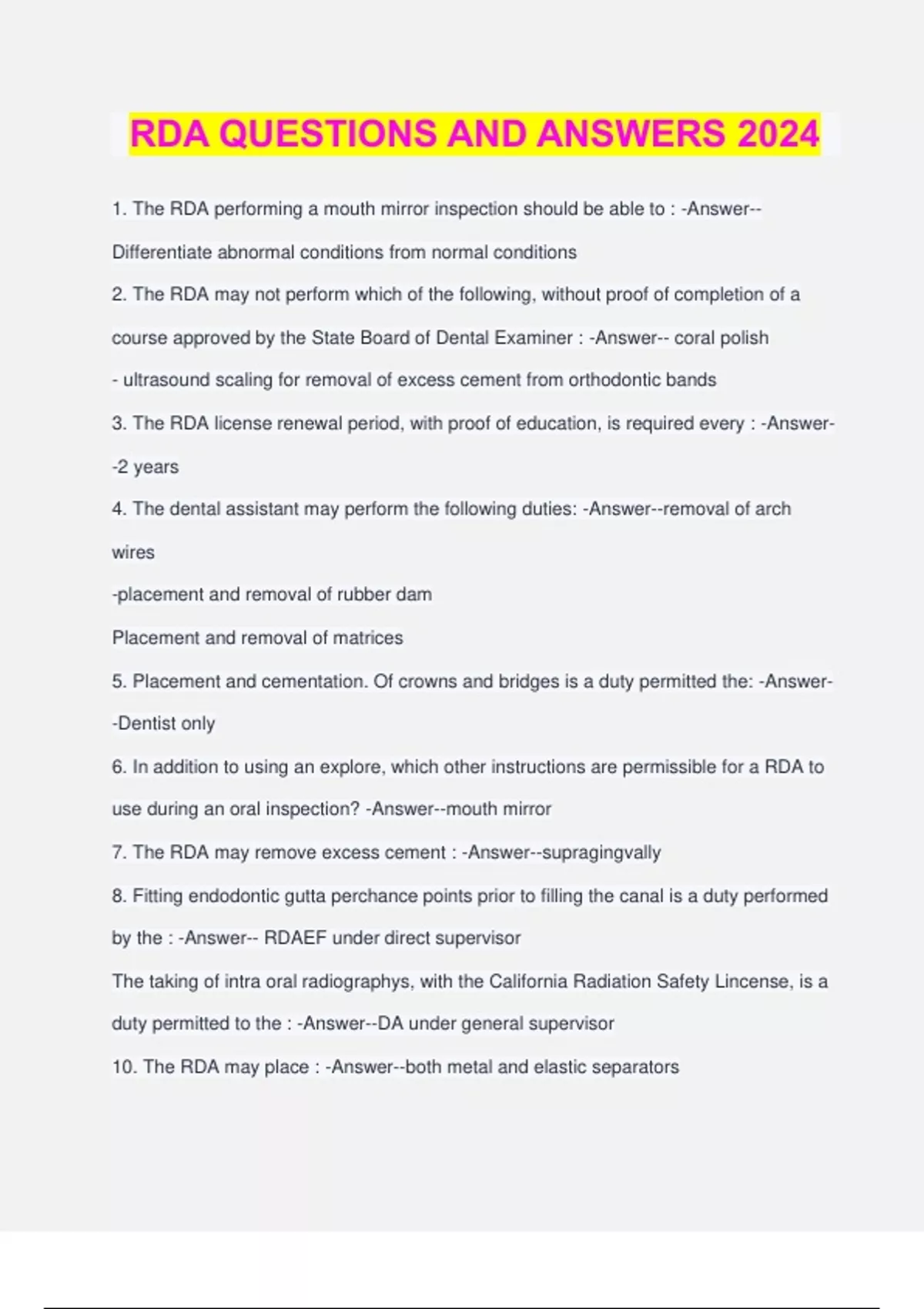 RDA QUESTIONS AND ANSWERS 2024 1. The RDA performing a mouth mirror inspection should be able to : -Answer-- Differentiate abnormal conditions from normal conditions 2. The RDA may not perform which of the following, without proof of completion of a course approved by the State Board of Dental Examiner : -Answer-- coral polish - ultrasound scaling for removal of excess cement from orthodontic bands 3. The RDA license renewal period, with proof of education, is required every : -Answer- -2 years 4. The dental assistant may perform the following duties: -Answer--removal of arch wires -placement and removal of rubber dam Placement and removal of matrices 5. Placement and cementation. Of crowns and bridges is a duty permitted the: -Answer- -Dentist only 6. In addition to using an explore, which other instructions are permissible for a RDA to use during an oral inspection? -Answer--mouth mirror 7. The RDA may remove excess cement : -Answer--supragingvally 8. Fitting endodontic gutta perchance points prior to filling the canal is a duty performed by the : -Answer-- RDAEF under direct supervisor The taking of intra oral radiographys, with the California Radiation Safety Lincense, is a duty permitted to the : -Answer--DA under general supervisor 10. The RDA may place : -Answer--both metal and elastic separators - under the direct supervisor of a licensed dentist 11. The non-aerosol topical agent may be applied by the: -Answer--DA or RDA 12. A DA or RDA MAY NOT TAKE IMPRESSION for : -Answer-- crown - bridges - and intra oral prosthetics The RDA may remove excess cement : -Answer--along the cervical third of the tooth - supragingvally - under direct supervisor of a licensed dentist 14. How many hour of continuing education are required per renewal period for licensure of and RDA: -Answer-- 25 - biennially 15. Sizing and cementation of temporary crowns may be performed by : -Answer--RDA - UNDER DIRECT SUPERVISION 16. A Mother bring her child to the office when the dentist is not there. The child hasWAS. a toothache and an obvious large cavity. The dentist is contacted at home and is made aware of the patients problem which of the following tasks may be performed : -Answer-- take x-ray and reschedule -refer to another dentist - do a mouth mirror inspection by a RDA under general supervision