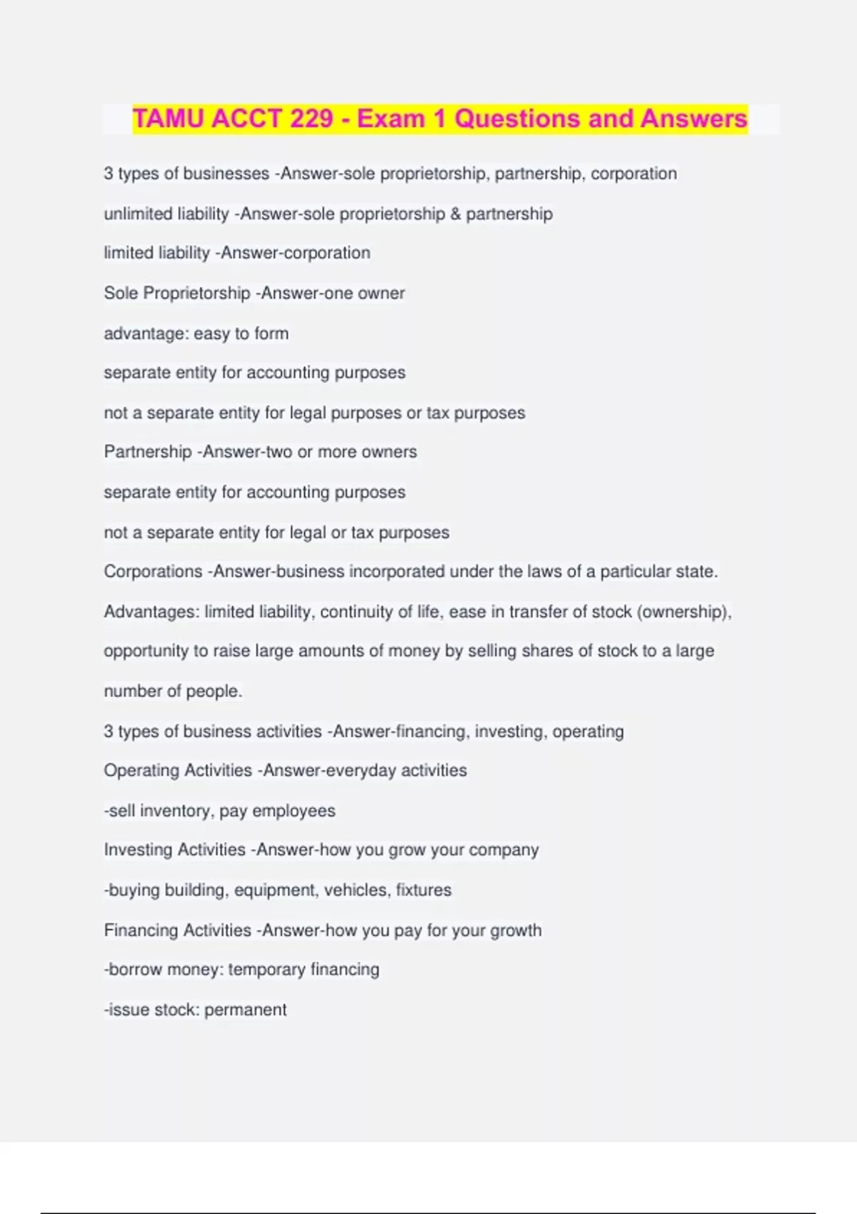 TAMU ACCT 229 - Exam 1 Questions and Answers 3 types of businesses -Answer-sole proprietorship, partnership, corporation unlimited liability -Answer-sole proprietorship & partnership limited liability -Answer-corporation Sole Proprietorship -Answer-one owner advantage: easy to form separate entity for accounting purposes not a separate entity for legal purposes or tax purposes Partnership -Answer-two or more owners separate entity for accounting purposes not a separate entity for legal or tax purposes Corporations -Answer-business incorporated under the laws of a particular state. Advantages: limited liability, continuity of life, ease in transfer of stock (ownership), opportunity to raise large amounts of money by selling shares of stock to a large number of people. 3 types of business activities -Answer-financing, investing, operating Operating Activities -Answer-everyday activities -sell inventory, pay employees Investing Activities -Answer-how you grow your company -buying building, equipment, vehicles, fixtures Financing Activities -Answer-how you pay for your growth -borrow money: temporary financing -issue stock: permanent 4 financial statements -Answer-Income statement Statement of Retained Earnings Balance Sheet Statement of Cash Flows What does a balance sheet show? -Answer-Shows the financial position of a company at a point in time. A = L + SHE Assests -Answer-what a company owns, or what is owed to a company Laiabilities -Answer-what the company owes Stockholders Equity -Answer-ownership. (common stock & retained earnings) Monetary Unity Assumption -Answer-Only transactions that can be expressed in terms of money can be included in the accounting records Economic Entity Assumption -Answer-Activities of the business are separate from activities of the owners Time Period Assumption -Answer-The long life of a company can be reported over a series of shorter time periods. Makes it possible to prepare the Income Statements for a specific time period