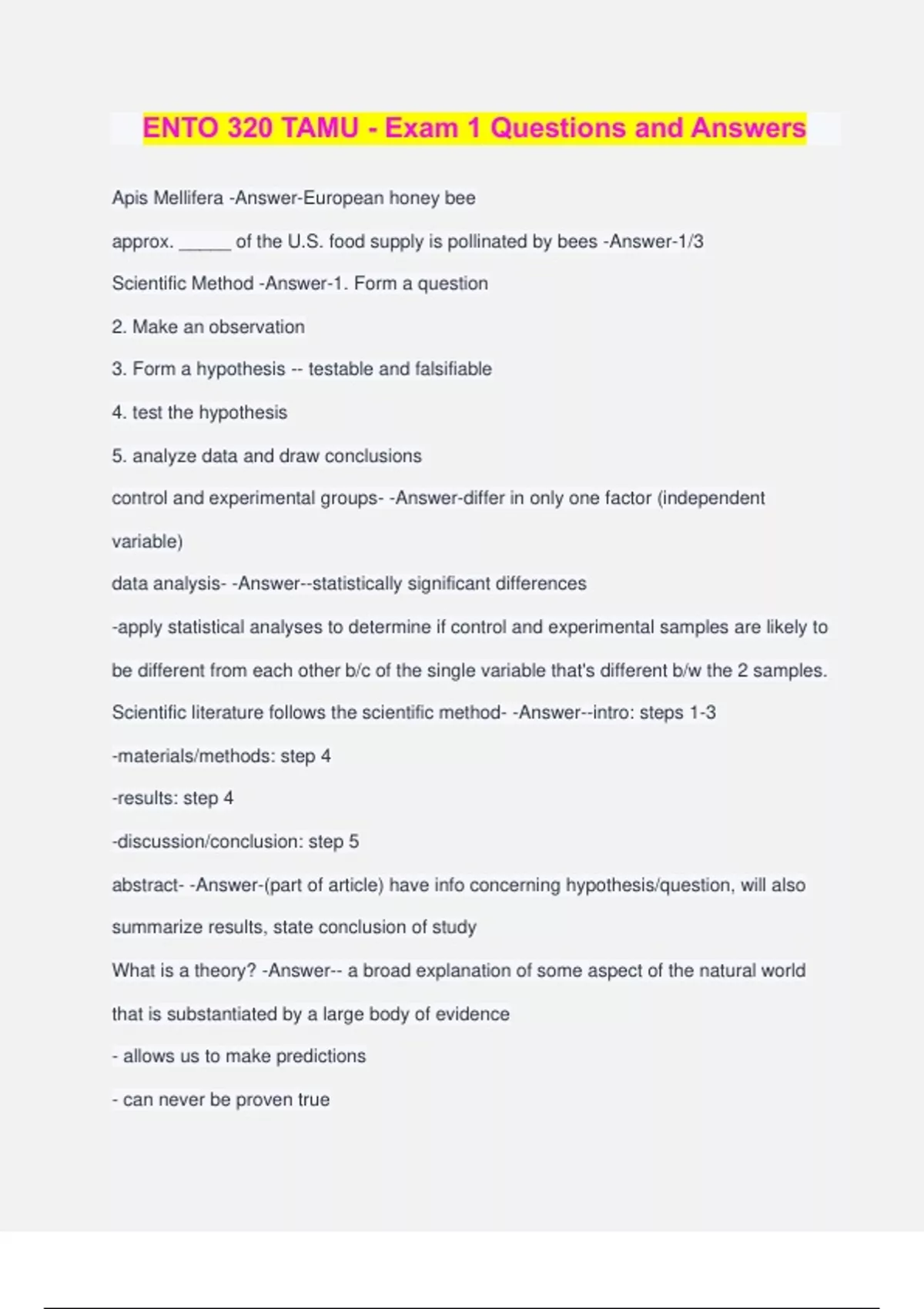 ENTO 320 TAMU - Exam 1 Questions and Answers Apis Mellifera -Answer-European honey bee approx. _____ of the U.S. food supply is pollinated by bees -Answer-1/3 Scientific Method -Answer-1. Form a question 2. Make an observation 3. Form a hypothesis -- testable and falsifiable 4. test the hypothesis 5. analyze data and draw conclusions control and experimental groups- -Answer-differ in only one factor (independent variable) data analysis- -Answer--statistically significant differences -apply statistical analyses to determine if control and experimental samples are likely to be different from each other b/c of the single variable that's different b/w the 2 samples. Scientific literature follows the scientific method- -Answer--intro: steps 1-3 -materials/methods: step 4 -results: step 4 -discussion/conclusion: step 5 abstract- -Answer-(part of article) have info concerning hypothesis/question, will also summarize results, state conclusion of study What is a theory? -Answer-- a broad explanation of some aspect of the natural world that is substantiated by a large body of evidence - allows us to make predictions - can never be proven true - extremely likely to be true, due to overwhelming evidence THEORY IS NOT A HYPOTHESIS!!!!! -Answer- What is a law? -Answer-- a description of what nature does under certain conditions - general statements for which no exceptions have been found - accepted to be true and universal - Rare Theory of Evolution -Answer-- Evolution= changes in genetic makeup over time -"Descent with modification" -Mechanism behind evolution includes -natural selection -mutations -genetic drift -migration Who's idea was the Theory of Evolution? -Answer-Charles Darwin and Alfred Wallace emergent properties -Answer-- a property that develops due to increasing complexity. - an individual component of the system may not exhibit that property, but the system gains new properties with increase in individuals. - EX: human body Taxonomy- -Answer-The science of identifying, descr