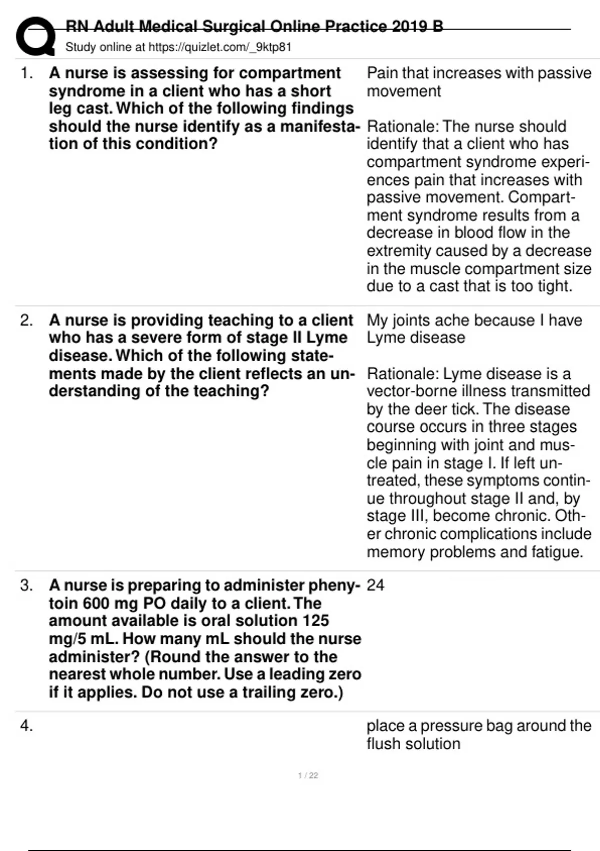 1. A nurse is assessing for compartment syndrome in a client who has a short leg cast. Which of the following findings should the nurse identify as a manifesta tion of this condition? Pain that increases with passive movement Rationale: The nurse should identify that a client who has compartment syndrome experi ences pain that increases with passive movement. Compart ment syndrome results from a decrease in blood flow in the extremity caused by a decrease in the muscle compartment size due to a cast that is too tight. 2. A nurse is providing teaching to a client who has a severe form of stage II Lyme disease. Which of the following state ments made by the client reflects an un derstanding of the teaching? My joints ache because I have Lyme disease Rationale: Lyme disease is a vector-borne illness transmitted by the deer tick. The disease course occurs in three stages beginning with joint and mus cle pain in stage I. If left un treated, these symptoms contin ue throughout stage II and, by stage III, become chronic. Oth er chronic complications include memory problems and fatigue. 3. A nurse is preparing to administer pheny toin 600 mg PO daily to a client. The amount available is oral solution 125 mg/5 mL. How many mL should the nurse administer? (Round the answer to the nearest whole number. Use a leading zero if it applies. Do not use a trailing zero.) 24 4. place a pressure bag around the flush solutio