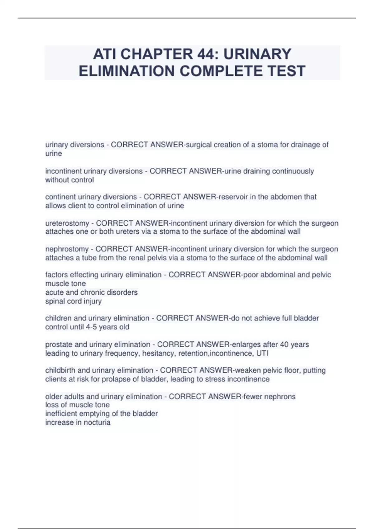 ATI CHAPTER 44: URINARY ELIMINATION COMPLETE TEST