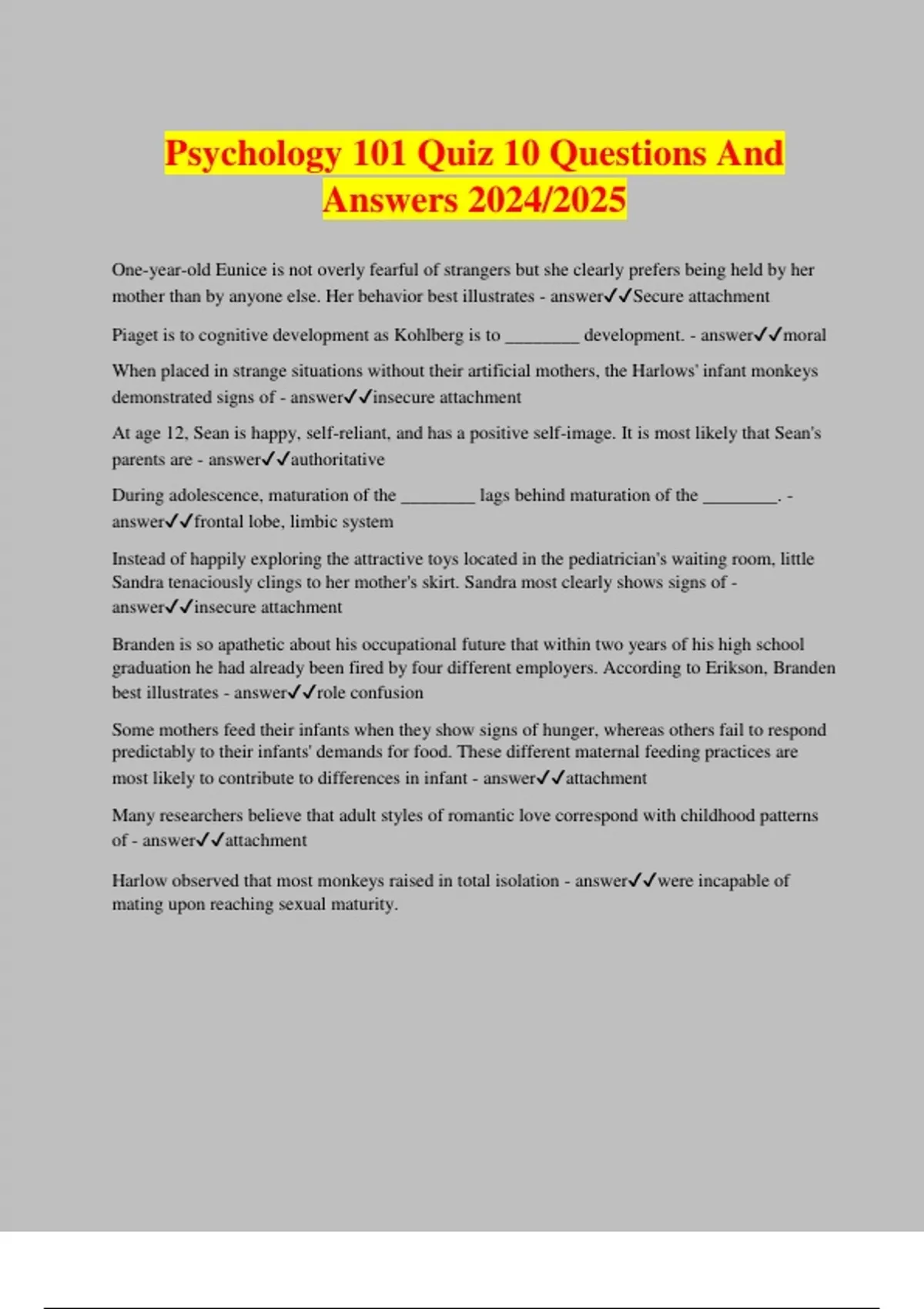 Psychology 101 Quiz 10 Questions And Answers 2024/2025 One-year-old Eunice is not overly fearful of strangers but she clearly prefers being held by her mother than by anyone else. Her behavior best illustrates - answerSecure attachment Piaget is to cognitive development as Kohlberg is to ________ development. - answermoral When placed in strange situations without their artificial mothers, the Harlows' infant monkeys demonstrated signs of - answerinsecure attachment At age 12, Sean is happy, self-reliant, and has a positive self-image. It is most likely that Sean's parents are - answerauthoritativ