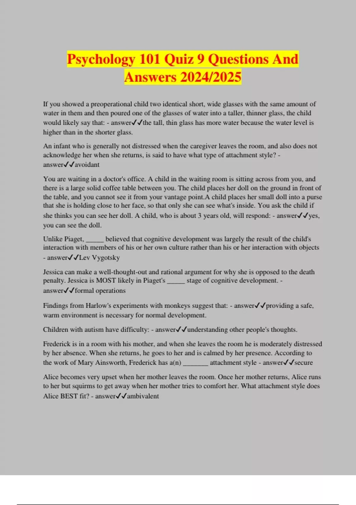 Psychology 101 Quiz 9 Questions And Answers 2024/2025 If you showed a preoperational child two identical short, wide glasses with the same amount of water in them and then poured one of the glasses of water into a taller, thinner glass, the child would likely say that: - answerthe tall, thin glass has more water because the water level is higher than in the shorter glass. An infant who is generally not distressed when the caregiver leaves the room, and also does not acknowledge her when she returns, is said to have what type of attachment style? - answeravoidant You are waiting in a doctor's office. A child in the waiting room is sitting across from you, and there is a large solid coffee table between you. The child places her doll on the ground in front of the table, and you cannot see it from your vantage point.A child places her small doll into a purse that she is holding close to her face, so that only she can see what's inside. You ask the child if she thinks you can see her doll. A child, who is about 3 years old, will respond: - answeryes, you can see the doll. Unlike Piaget, _____ believed that cognitive development was largely the result of the child's interaction with members of his or her own culture rather than his or her interaction with objects - answerLev Vygotsky