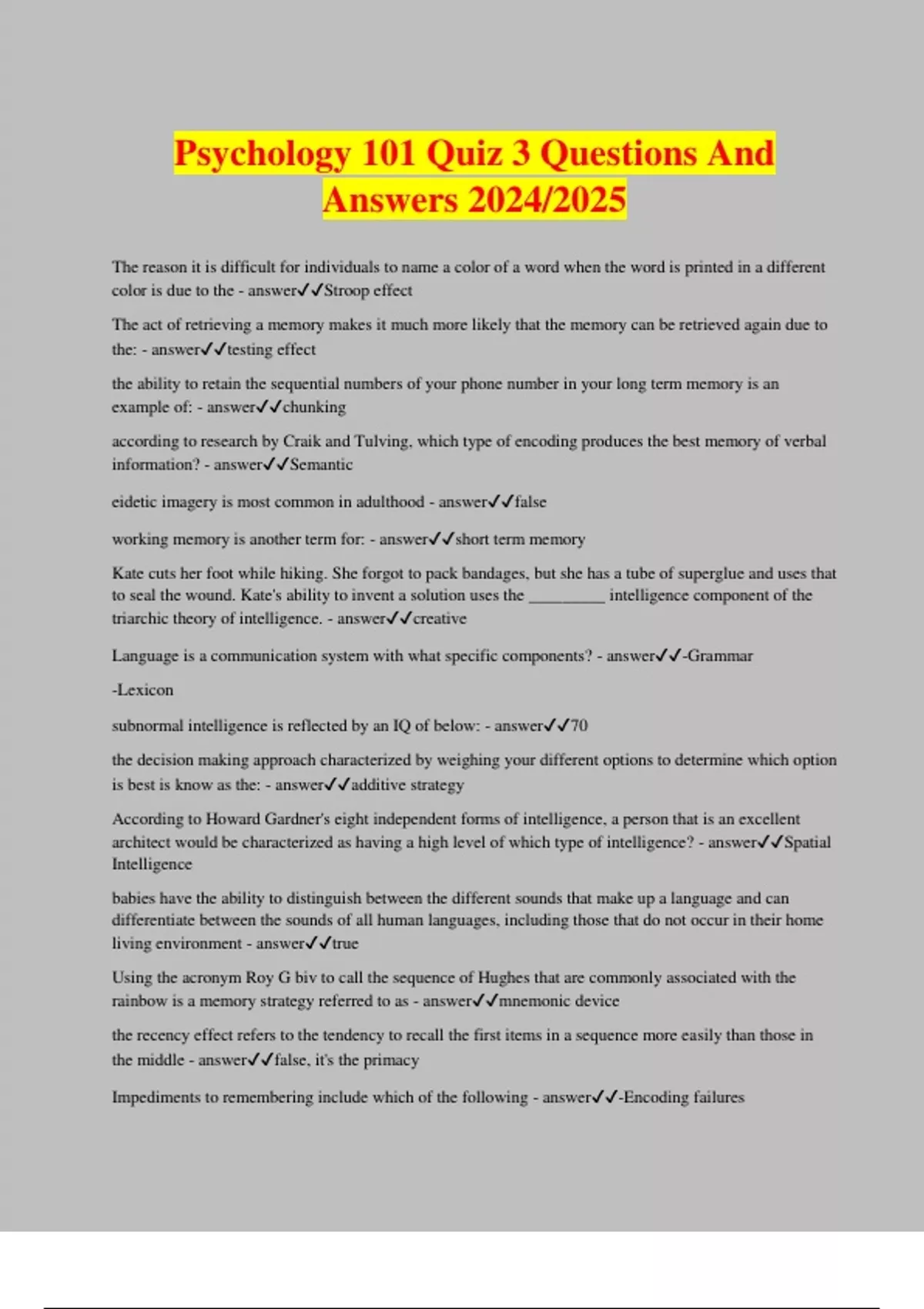 Psychology 101 Quiz 3 Questions And Answers 2024/2025