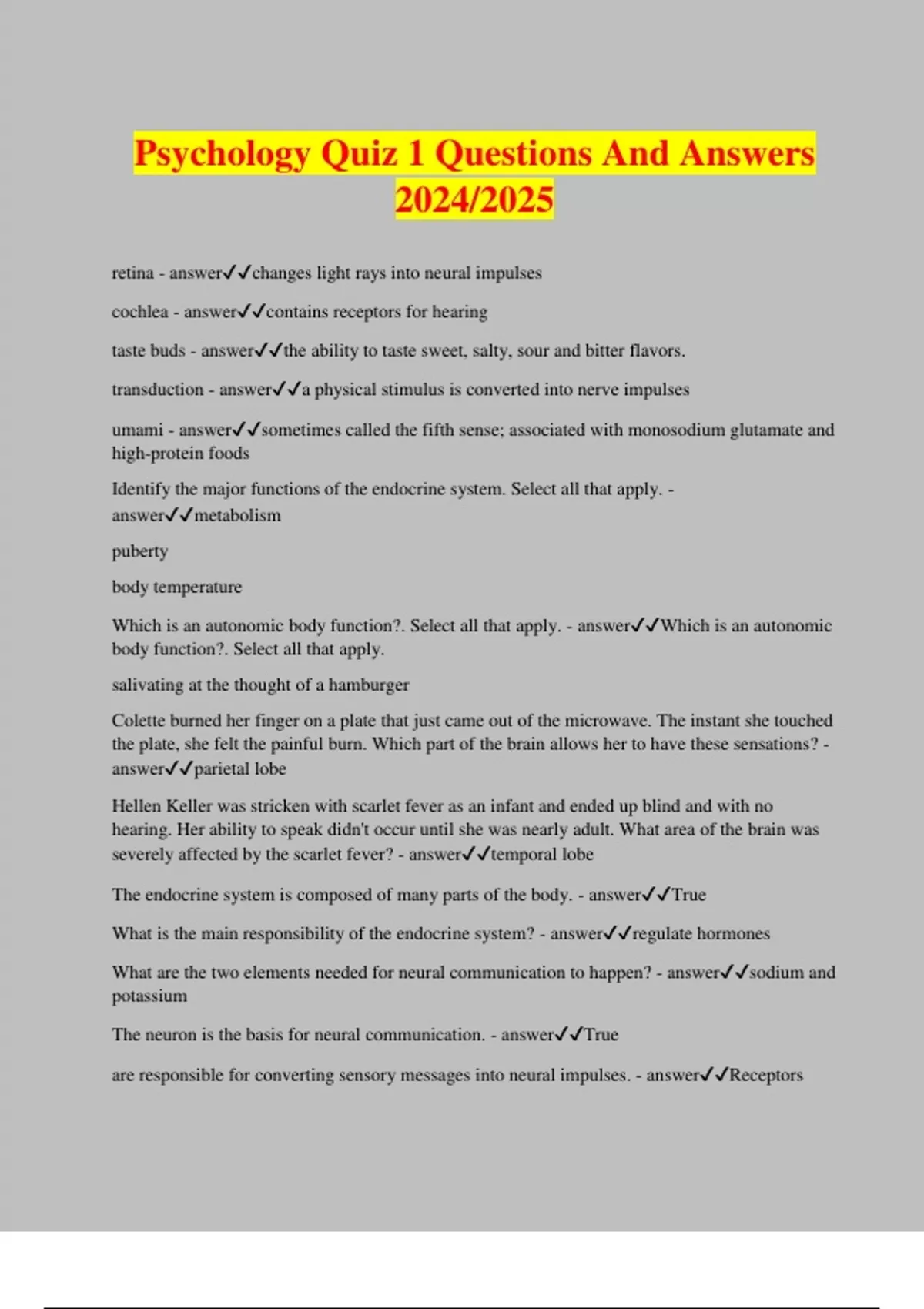 Psychology Quiz 1 Questions And Answers 2024/2025 retina - answerchanges light rays into neural impulses cochlea - answercontains receptors for hearing taste buds - answerthe ability to taste sweet, salty, sour and bitter flavors. transduction - answera physical stimulus is converted into nerve impulses umami - answersometimes called the fifth sense; associated with monosodium glutamate and high-protein foods Identify the major functions of the endocrine system. Select all that apply. - answermetabolism puberty body temperature Which is an autonomic body function?. Select all that apply. - answerWhich is an autonomic body function?. Select all that apply