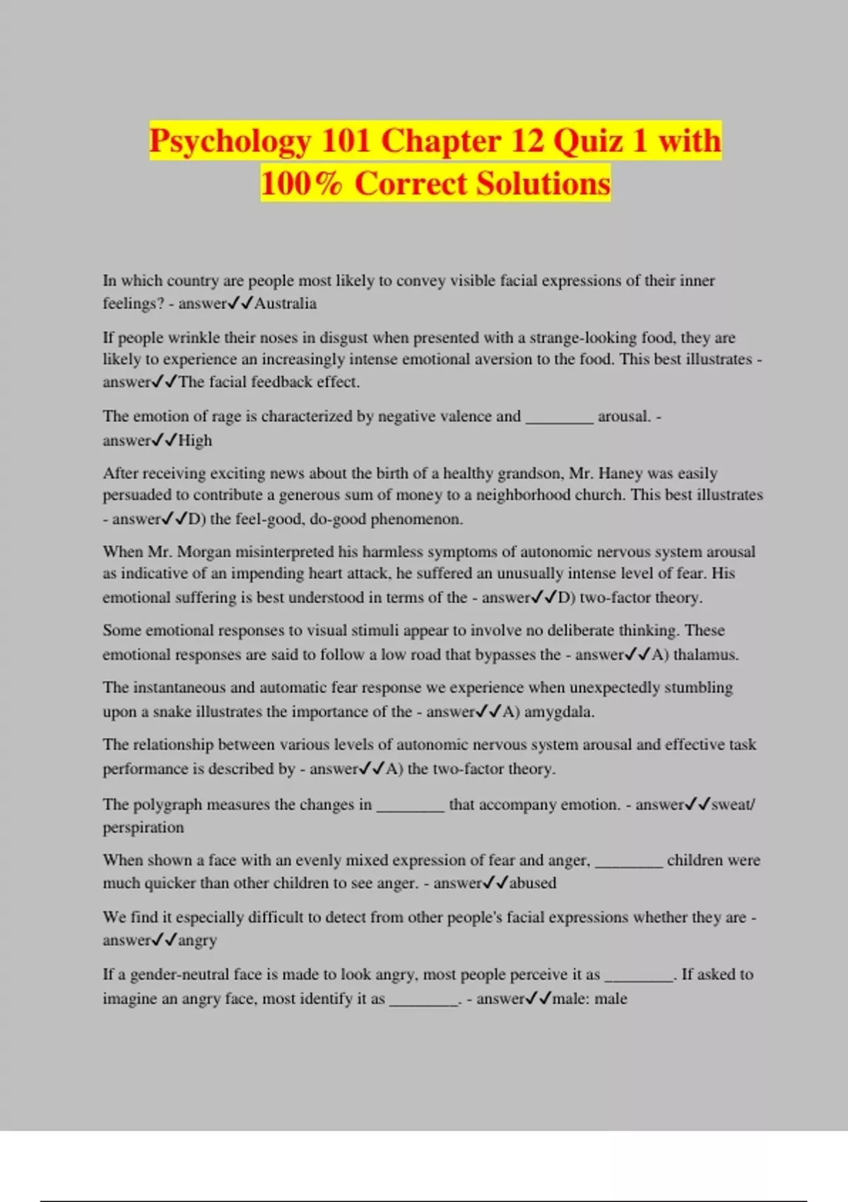 Psychology 101 Chapter 12 Quiz 1 with 100% Correct Solutions In which country are people most likely to convey visible facial expressions of their inner feelings? - answerAustralia If people wrinkle their noses in disgust when presented with a strange-looking food, they are likely to experience an increasingly intense emotional aversion to the food. This best illustrates - answerThe facial feedback effect. The emotion of rage is characterized by negative valence and ________ arousal. - answerHigh After receiving exciting news about the birth of a healthy grandson, Mr. Haney was easily persuaded to contribute a generous sum of money to a neighborhood church. This best illustrates - answerD) the feel-good, do-good phenomenon. When Mr. Morgan misinterpreted his harmless symptoms of autonomic nervous system arousal as indicative of an impending heart attack, he suffered an unusually intense level of fear. His emotional suffering is best understood in terms of the - answerD) two-factor theory. Some emotional responses to visual stimuli appear to involve no deliberate thinking. These emotional responses are said to follow a low road that bypasses the - answerA) thalamus. The instantaneous and automatic fear response we experience when unexpectedly stumbling upon a snake illustrates the importance of the - answerA) amygdala. The relationship between various levels of autonomic nervous system arousal and effective task performance is described by - answerA) the two-factor theory