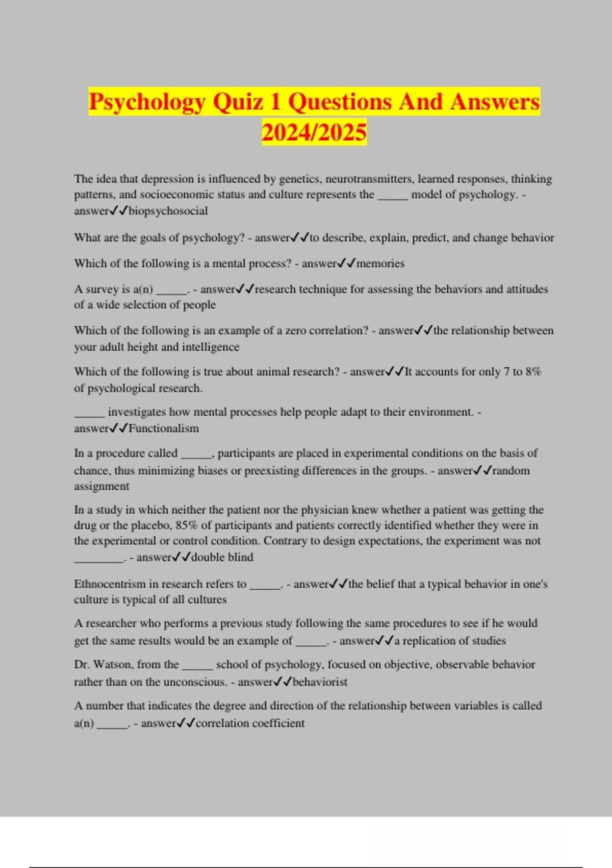 Psychology Quiz 1 Questions And Answers 2024/2025 The idea that depression is influenced by genetics, neurotransmitters, learned responses, thinking patterns, and socioeconomic status and culture represents the _____ model of psychology. - answerbiopsychosocial What are the goals of psychology? - answerto describe, explain, predict, and change behavior Which of the following is a mental process? - answermemories A survey is a(n) _____. - answerresearch technique for assessing the behaviors and attitudes of a wide selection of people Which of the following is an example of a zero correlation? - answerthe relationship between your adult height and intelligence Which of the following is true about animal research? - answerIt accounts for only 7 to 8% of psychological research. _____ investigates how mental processes help people adapt to their environment. - answerFunctionalism In a procedure called _____, participants are placed in experimental conditions on the basis of chance, thus minimizing biases or preexisting differences in the groups. - answerrandom assignment In a study in which neither the patient nor the physician knew whether a patient was getting the drug or the placebo, 85% of participants and patients correctly identified whether they were in the experimental or control condition. Contrary to design expectations, the experiment was not ________. - answerdouble blind Ethnocentrism in research refers to _____. - answerthe belief that a typical behavior in one's culture is typical of all cultures A researcher who performs a previous study following the same procedures to see if he would get the same results would be an example of _____. - answera replication of studies Dr. Watson, from the _____ school of psychology, focused on objective, observable behavior rather than on the unconscious. - answerbehavior