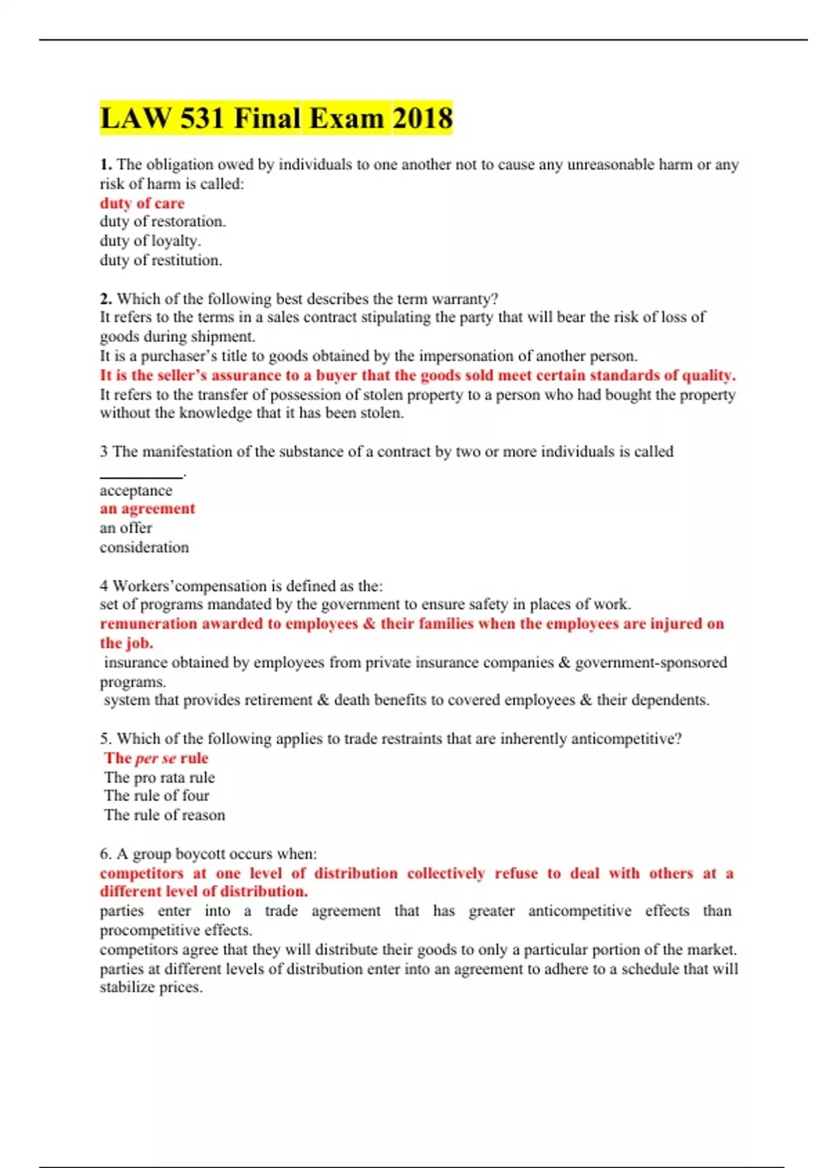 LAW 531 Final Exam 2018 1. The obligation owed by individuals to one another not to cause any unreasonable harm or any risk of harm is called: duty of care duty of restoration. duty of loyalty. duty of restitution. 2. Which of the following best describes the term warranty? It refers to the terms in a sales contract stipulating the party that will bear the risk of loss of goods during shipment. It is a purchaser’s title to goods obtained by the impersonation of another person. It is the seller’s assurance to a buyer that the goods sold meet certain standards of quality. It refers to the transfer of possession of stolen property to a person who had bought the property without the knowledge that it has been stolen. 3 The manifestation of the substance of a contract by two or more individuals is called . acceptance an agreement an offer consideration 4 Workers’compensation is defined as the: set of programs mandated by the government to ensure safety in places of work. remuneration awarded to employees & their families when the employees are injured on the job. insurance obtained by employees from private insurance companies & government-sponsored programs. system that provides retirement & death benefits to covered employees & their dependents. 5. Which of the following applies to trade restraints that are inherently anticompetitive? The per se rule The pro rata rule The rule of four The rule of reason 6. A group boycott occurs when: competitors at one level of distribution collectively refuse to deal with others at a different level of distribution. parties enter into a trade agreement that has greater anticompetitive effects than procompetitive effects. competitors agree that they will distribute their goods to only a particular portion of the market. parties at different levels of distribution enter into an agreement to adhere to a schedule that will stabilize prices. 7. Which of the following scenarios is an example of law & ethics contradicting each other? the trademarked garment designs of a well-known fashion designer. A restaurateur, whose restaurant is violating labor laws, bribes a federal official to prevent him from reporting the violations. A florist in the United States employs an illegal immigrant to help the immigrant & her family overcome their financial difficulties. An iron-ore manufacturing company provides its employees with high-quality safety equipment. 8. Corporate officers are elected by a corporation’s . board of directors preferred stockholders owners common stockholders 9. Which of the following is a category of torts? Personal liability Nonintent crime Professional malpractice Strict liability 10. Corporate officers are best described as: owners of a corporation with limited liability for its debts & obligations. directors elected by a corporation’s shareholders. employees appointed to manage the daily operations of a corporation. partners pursuing a joint venture transaction 11. Which of the following is a remedy that requires the breaching party to perform the acts promised in a contract? Binding arbitration Special damages Specific performance Punitive damages 12. Helen buys a toy railway set for her 3-year-old son, Ben. The product’s cover mentions that the toy is suitable for children only aged between 3 & 12. While playing with the toy one evening, without Helen’s supervision, Ben chokes on an inch-long engine driver figure that forms part of the train. Although he survives, he is traumatized by the incident. For which type of defect can Helen sue the toy manufacturer? Failure to tamperproof Defect in product packaging Failure to warn Defect in manufacture 13. An agency that appears to be created by a principal but does not exist in reality is called a(n) .