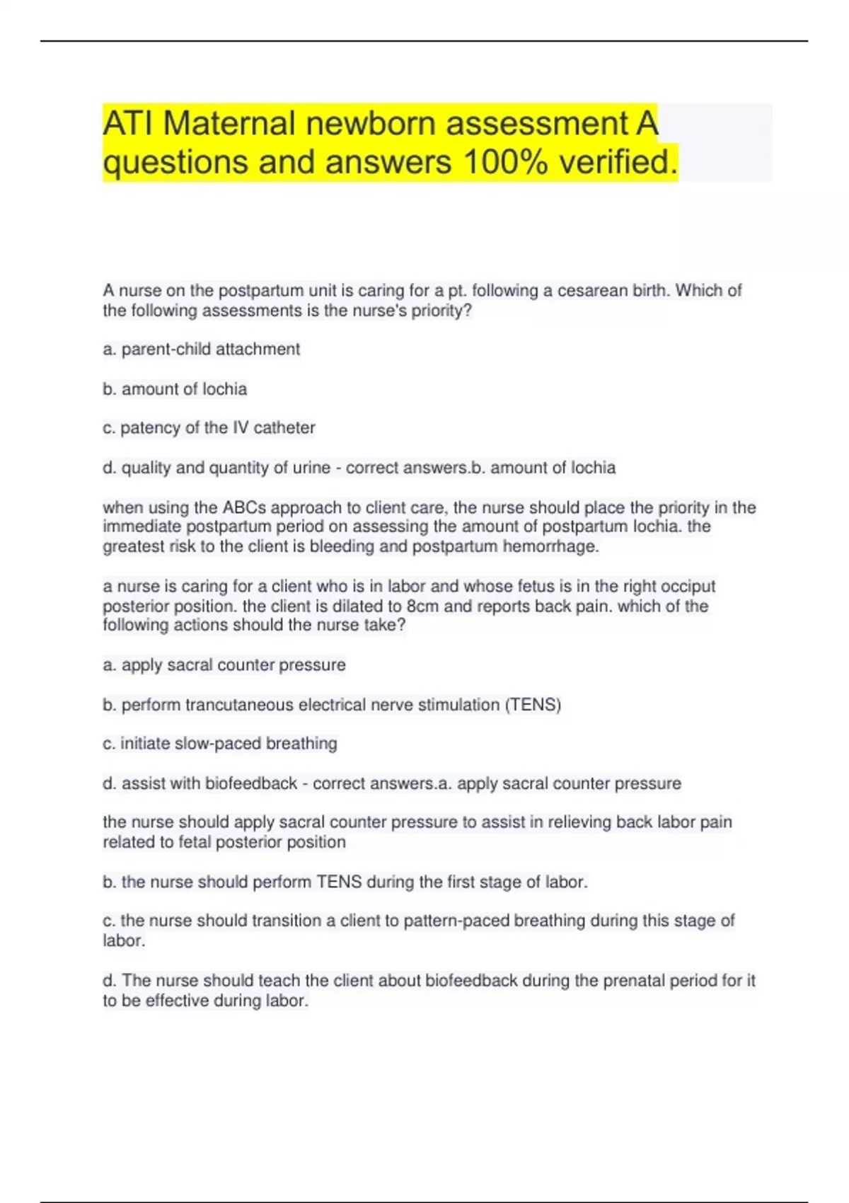 ATI Maternal newborn assessment A questions and answers 100% verified. A nurse on the postpartum unit is caring for a pt. following a cesarean birth. Which of the following assessments is the nurse's priority? a. parent-child attachment b. amount of lochia c. patency of the IV catheter d. quality and quantity of urine - correct answers.b. amount of lochia when using the ABCs approach to client care, the nurse should place the priority in the immediate postpartum period on assessing the amount of postpartum lochia. the greatest risk to the client is bleeding and postpartum hemorrhage. a nurse is caring for a client who is in labor and whose fetus is in the right occiput posterior position. the client is dilated to 8cm and reports back pain. which of the following actions should the nurse take? a. apply sacral counter pressure b. perform trancutaneous electrical nerve stimulation (TENS) c. initiate slow-paced breathing d. assist with biofeedback - correct answers.a. apply sacral counter pressure the nurse should apply sacral counter pressure to assist in relieving back labor pain related to fetal posterior position b. the nurse should perform TENS during the first stage of labor. c. the nurse should transition a client to pattern-paced breathing during this stage of labor. d. The nurse should teach the client about biofeedback during the prenatal period for it to be effective during labor. a nurse is demonstrating to a client how to bathe her newborn. in which order should the nurse perform the following actions a. wipe the newborn's eyes from inner canthus outward b. wash the newborn's legs and feet c. wash the newborn's neck by lifting the newborn's chin d. cleanse the skin around the newborn's umbilical stump e. clean the newborn's diaper area - correct answers.a. wipe the newborn's eyes from inner canthus outward c. wash the newborn's neck by lifting the newborn's chin d. cleanse the skin around the newborn's umbilical stump b. wash the newborn's legs and feet e. clean the newborn's diaper area The nurse should demonstrate how to bathe a newborn by using a head to toe, clean to dirty, approach. a nurse is caring for a client and her partner who have experienced a fetal death. which of the following actions should the nurse take? a. take photos of the newborn to give to the parents b. tell the parents that they can consider organ donation c. encourage the parents to avoid allowing older children to visit them in the hospital d. explain to the parents the need to name the newborn - correct answers.a. take photos of the newborn to give to the parents the nurse should create a memory box that includes mementos of the newborn (ex: photos, ID bands, newborn hat and blanket) b. Organ donation can be considered if a newborn is delivered alive. c. The nurse should encourage the client to allow older children to come to the hospital as a beneficial part of the grieving process.