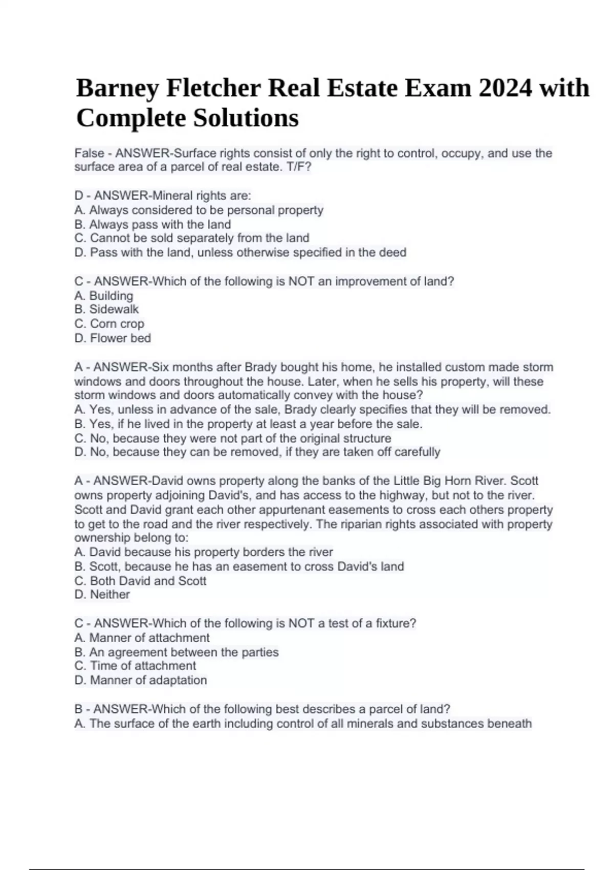 Barney Fletcher Real Estate Exam 2024 with Complete Solutions. False - ANSWER-Surface rights consist of only the right to control, occupy, and use the surface area of a parcel of real estate. T/F? D - ANSWER-Mineral rights are: A. Always considered to be personal property B. Always pass with the land C. Cannot be sold separately from the land D. Pass with the land, unless otherwise specified in the deed C - ANSWER-Which of the following is NOT an improvement of land? A. Building B. Sidewalk C. Corn crop D. Flower bed A - ANSWER-Six months after Brady bought his home, he installed custom made storm windows and doors throughout the house. Later, when he sells his property, will these storm windows and doors automatically convey with the house? A. Yes, unless in advance of the sale, Brady clearly specifies that they will be removed. B. Yes, if he lived in the property at least a year before the sale. C. No, because they were not part of the original structure D. No, because they can be removed, if they are taken off carefully A - ANSWER-David owns property along the banks of the Little Big Horn River. Scott owns property adjoining David's, and has access to the highway, but not to the river. Scott and David grant each other appurtenant easements to cross each others property to get to the road and the river respectively. The riparian rights associated with property ownership belong to: A. David because his property borders the river B. Scott, because he has an easement to cross David's land C. Both David and Scott D. Neither C - ANSWER-Which of the following is NOT a test of a fixture? A. Manner of attachment B. An agreement between the parties C. Time of attachment D. Manner of adaptation B - ANSWER-Which of the following best describes a parcel of land? A. The surface of the earth including control of all minerals and substances beneath Barney Fletcher Real Estate Exam 2024 with Complete Solutions B. The surface of the earth extending down to the center and upward to the sky C. The earth's surface closely marked by certain boundaries D. The surface of the earth extending down a reasonable distance and up into the air a reasonable distance False - ANSWER-Littoral rights is a term referring to all water rights T/F? C - ANSWER-Each of the following is a test of whether or not something is a fixture, EXCEPT: A. Method of attachment B. Adaptability C. Cost D. Relationship of the parties Ownership - ANSWER-The right of one party to possess and use real property exclusive of others is: C - ANSWER-A prospective buyer noticed an ornate flag pole attached to the front porch of the house she wants to purchase. She wants to make certain that the flag pole is included in the sale. What should the agent do? A, Because the pole is attached and will automatically convey B. call seller and advise them the buyer wants the pole C. include the flag pole in the offer to purchase D. photograph the flag pole as evidence of its attachment B - ANSWER-A couple is interested in buying a house that has an odd shaped living room. The current owners had a custom-made, free-standing bookcase built to specifically fit into one part of the room. The buyer believes this is a fixture because it is uniquely adapted to this specific room. The seller believes this is not a fixture because it is free-standing. To avoid any misunderstandings, what should the listing licensee do? A. Assure the seller there is nothing to worry about B. Include a provision in the agreement of sale (and listing contract) that states whether the bookcase is included with the sale or not. C. Assure the buyer there is nothing to worry about D. File an interpleader action in court B - ANSWER-Real property would include: A. Fixtures B. Each of these choices C. Air space D. Mineral rights a fixture - ANSWER-Personal property which is attached to a building and which will convey with the land is known as? B - ANSWER-All of the following are personal property EXCEPT: A. Trade fixtures B. a privacy fence C. patio furniture D. portable dishwasher assemblage; plottage - ANSWER-Merging two or more properties into common ownership is known as _____, while any increase in value that results is known as _____. Situs - ANSWER-Two real estate developers are working on similar but competing commercial developments. Both projects are finished at approximately the same time and are of similar quality and purpose. Which of the following would most likely characterize the reasons that one succeeds while the other fails? erosion - ANSWER-When the action of water causes moves soil away from a property, that is referred to as: C - ANSWER-Zorba leases a restaurant. He installs ovens, booths and counters. Which of the following is true? A. The ovens, booths and counters are fixtures that belong to the owner of the property and cannot be removed B. The ovens, booths and counters are trade fixtures and can be removed by Zorba at any time prior to or after the expiration of the lease. C. The ovens, booths and counters are trade fixtures and can be removed only prior to the expiration of Zorba's lease D. Zorba is not responsible for any damage caused by the removal of the fixtures True - ANSWER-Stocks, bonds, notes and mortgages are personal property. T/F? C; E - ANSWER-Which of the following is NOT recognized as personal property? (2) A. a lease B. a mortgage that secures personal property C. Replacement fixtures D. Cattle and horses E. an easement.