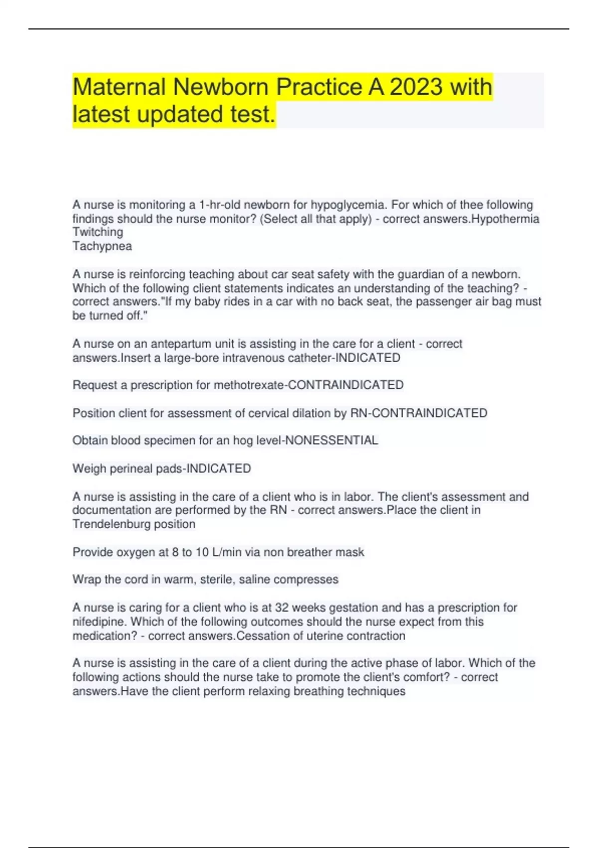 Maternal Newborn Practice A 2023 with latest updated test. A nurse is monitoring a 1-hr-old newborn for hypoglycemia. For which of thee following findings should the nurse monitor? (Select all that apply) - correct answers.Hypothermia Twitching Tachypnea A nurse is reinforcing teaching about car seat safety with the guardian of a newborn. Which of the following client statements indicates an understanding of the teaching? - correct answers."If my baby rides in a car with no back seat, the passenger air bag must be turned off." A nurse on an antepartum unit is assisting in the care for a client - correct answers.Insert a large-bore intravenous catheter-INDICATED Request a prescription for methotrexate-CONTRAINDICATED Position client for assessment of cervical dilation by RN-CONTRAINDICATED Obtain blood specimen for an hog level-NONESSENTIAL Weigh perineal pads-INDICATED A nurse is assisting in the care of a client who is in labor. The client's assessment and documentation are performed by the RN - correct answers.Place the client in Trendelenburg position Provide oxygen at 8 to 10 L/min via non breather mask Wrap the cord in warm, sterile, saline compresses A nurse is caring for a client who is at 32 weeks gestation and has a prescription for nifedipine. Which of the following outcomes should the nurse expect from this medication? - correct answers.Cessation of uterine contraction A nurse is assisting in the care of a client during the active phase of labor. Which of the following actions should the nurse take to promote the client's comfort? - correct answers.Have the client perform relaxing breathing techniques