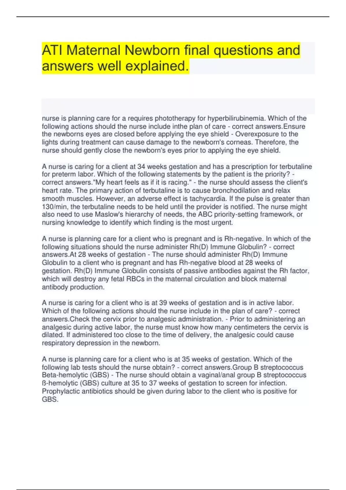 ATI Maternal Newborn final questions and answers well explained.