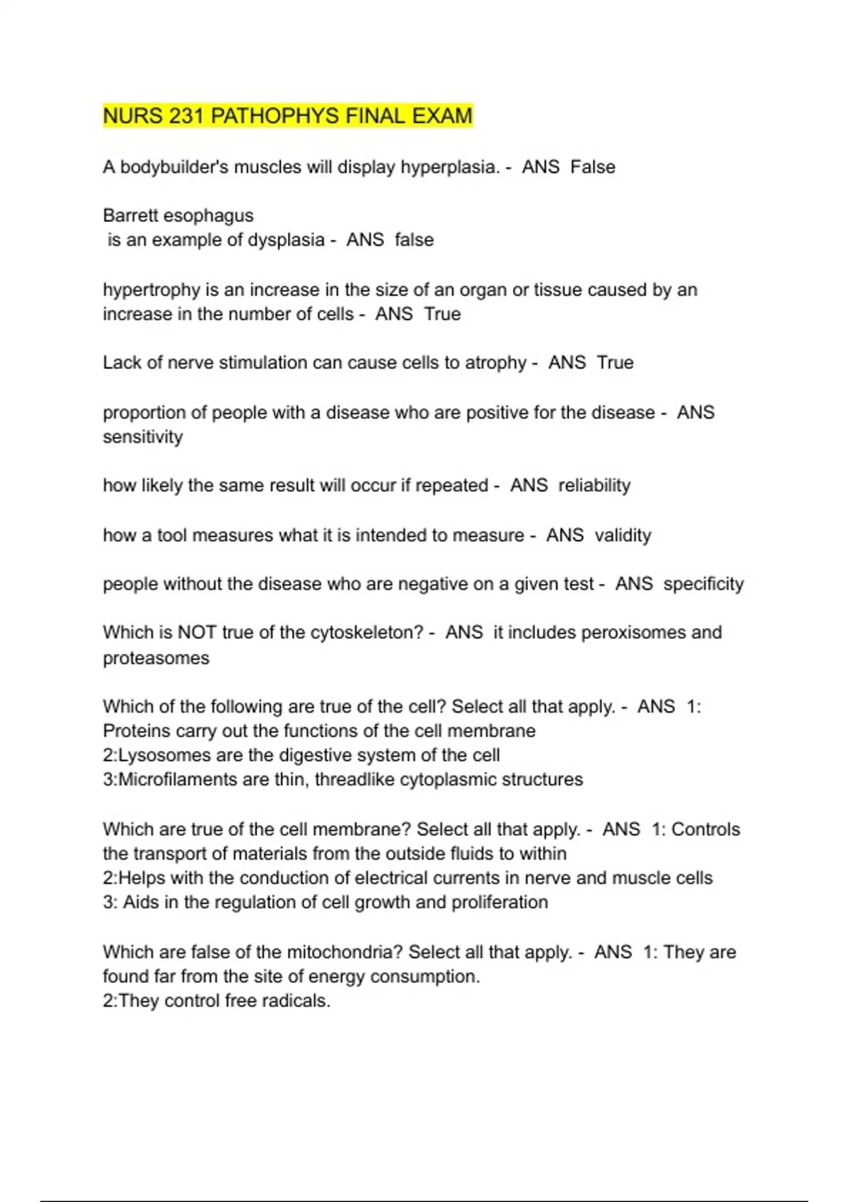 NURS 231 PATHOPHYS FINAL EXAM 2024