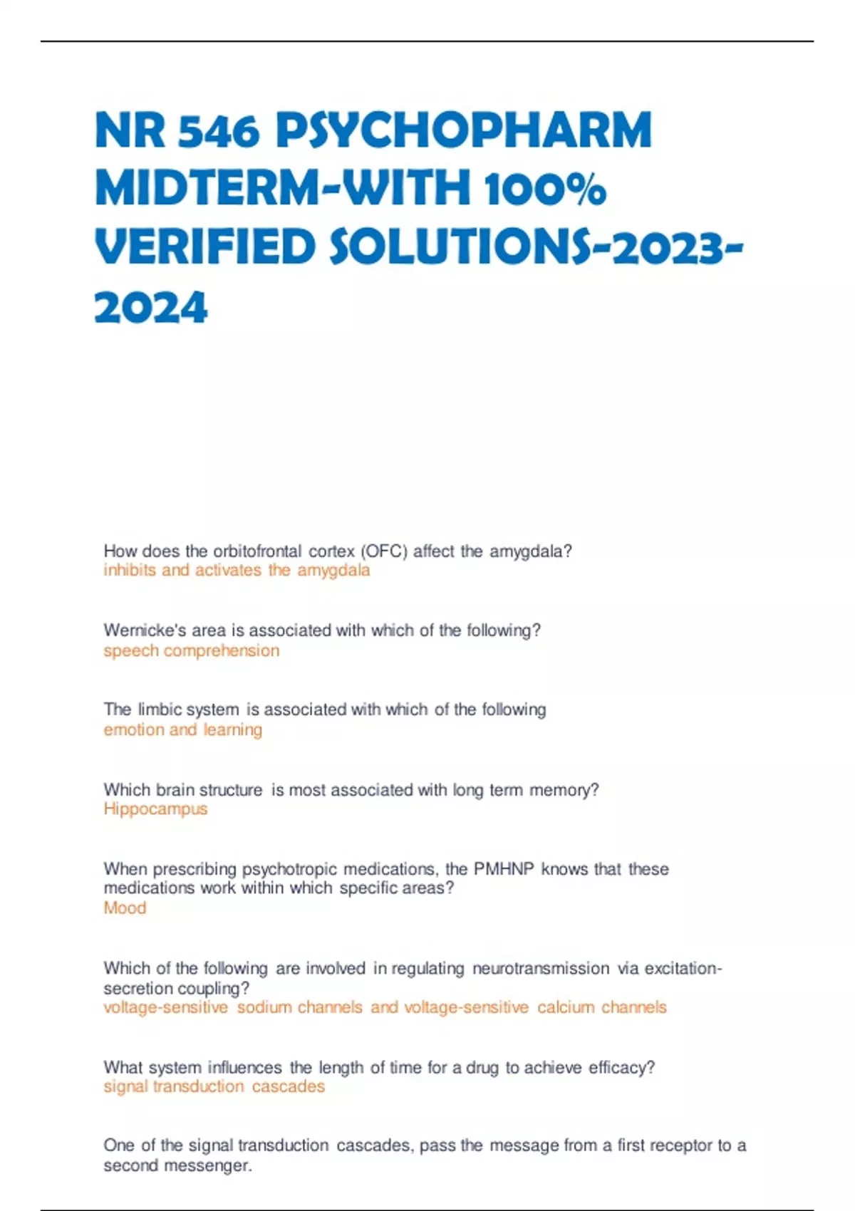 NR 546 PSYCHOPHARM MIDTERM-WITH 100% VERIFIED SOLUTIONS-2023- 2024 How does the orbitofrontal cortex (OFC) affect the amygdala? inhibits and activates the amygdala Wernicke's area is associated with which of the following? speech comprehension The limbic system is associated with which of the following emotion and learning Which brain structure is most associated with long term memory? Hippocampus When prescribing psychotropic medications, the PMHNP knows that these medications work within which specific areas? Mood Which of the following are involved in regulating neurotransmission via excitationsecretion coupling? voltage-sensitive sodium channels and voltage-sensitive calcium channels What system influences the length of time for a drug to achieve efficacy? signal transduction cascades One of the signal transduction cascades, pass the message from a first receptor to a second messenger. G protein linked systems Human central nervous system communication at synapses is which of the following? Chemical Which of the following is an excitatory neurotransmitter? Glutamate Which statement correctly pairs the pharmacodynamic effect with its definition? antagonist effect - drug binds to receptor, but does not activate a response A major current hypothesis for the cause of schizophrenia proposes that N-methyl-daspartate (NMDA) receptors may be which of the following? Correct! Hypofunctional Which medication is least associated with weight gain? Aripiprazole Which dopamine pathway is associated with positive symptoms of schizophrenia? mesolimbic pathway Which pathway is associated with negative symptoms? The mesocortical pathway Is part of the extrapyramidal nervous system and associated with extrapyramidal symptoms (EPS) nigrostriatal pathway This pathway is associated with hyperprolactinemia. The tuberoinfundibular pathway A 34-year old male recently began experiencing breast secretions while receiving risperidone . Which dopamine pathway is associated with this side effect? tuberoinfundibular pathway A 44-year-old woman is initiated on an atypical antipsychotic for the treatment of schizophrenia. Regarding affinity, atypical antipsychotics demonstrate which of the following most often? Atypical antipsychotics have equal positive symptom antipsychotic actions and low extrapyramidal symptoms. is a syndrome that can be associated with several different psychiatric disorders. Symptoms include hallucinations, delusions, disorganized speech, disorganized behavior, and distortions of reality. This syndrome can affect a person's cognition, affective response, communication, capacity to recognize reality, and ability to relate to others. Psychosis What Diagnosis require the presence of psychosis? Schizophrenia substance-induced psychotic disorders schizophreniform disorder schizoaffecive disorder delusional disorder brief psychotic disorder psychotic disorder due to a medical condition What diagnosis has a diagnosis of psychosis as a feature? Mania depression cognitive disorders dementia What are some positive symptoms? Hallucinations Delusions Thought disorder Hostility Excitability What are some Negative symptoms? Affective flattening Alogia Anhedonia Amotivation Asociality What area of the brain is associated with negative and affective symptoms? Mesocortical and ventromedial prefrontal cortex: What area of the brain is associated with cognitive symptoms? Dorsolateral What area of the brain is associated with aggressive, impulsive symptoms? Orbitofrontal and connections to the amygdala Non-selectively blocks dopamine D2 receptors, specifically in mesolimbic pathway. Improves Positive Symptoms Use: Acute & Chronic Schizophrenia & Psychosis First generation antipsychotics are associated with movement, intelligence, abstract thinking, the ability to organize, personality, behavior, and emotional control. Traumatic brain injuries can result in personality changes, difficulty controlling emotions, and other cognitive functions Frontal Lobes responsible for proprioception, is the home of the somatic senses. This part of the brain helps a person to identify spatial relationships, interpret pain and touch in the body, and identify and give meaning to objects Parietal Lobe (Middle Brain) Damage to the anterior portion may cause asterogenesis, the loss of ability to recognize objects via the sense of touch. This may be experienced by patients with post cerebral vascular accidents parietal Lobe and involved in short-term memory, speech, auditory signals, and smell recognition. It identifies "what" things are - object identification. It contains the limbic system, amygdala, and hippocampus. Temporal Lobe Disorders from this lobe include dementia, affective disorders, and attention deficit hyperactivity disorders (ADHD). Temporal Lobe controls visual processing. Damage to this lobe results in the inability to form visual memories. Bilateral lobe damage results in the inability to recognize items by sight even though vision is normal. Occipital Lobe This separates the frontal lobe from the parietal lobe. Central sulcus This controls the communication between the two brain hemispheres. Is involved in attention, impulse control, and emotion regulation. It integrates impulses from both sides of the brain. corpus callosum This is located deep in the temporal lobes and is involved in anxiety and memory, and shifting short-term to long-term memory. Hippocampus This is located deep in the temporal lobes and involved in emotional regulation and perception of odors. All smells travel directly to this structure. Cooking smells can elicit memories of childhood events and holidays. A traumatic event can result in the formation of the fear response, causing the fight or flight reflex within the autonomic nervous system and affects the hypothalamic-pituitary-adrenal (HPA) axis causing the release of stress hormones Amygdala This is an egg-shaped structure involved in sensory organ and motor command processing. All sensory sy