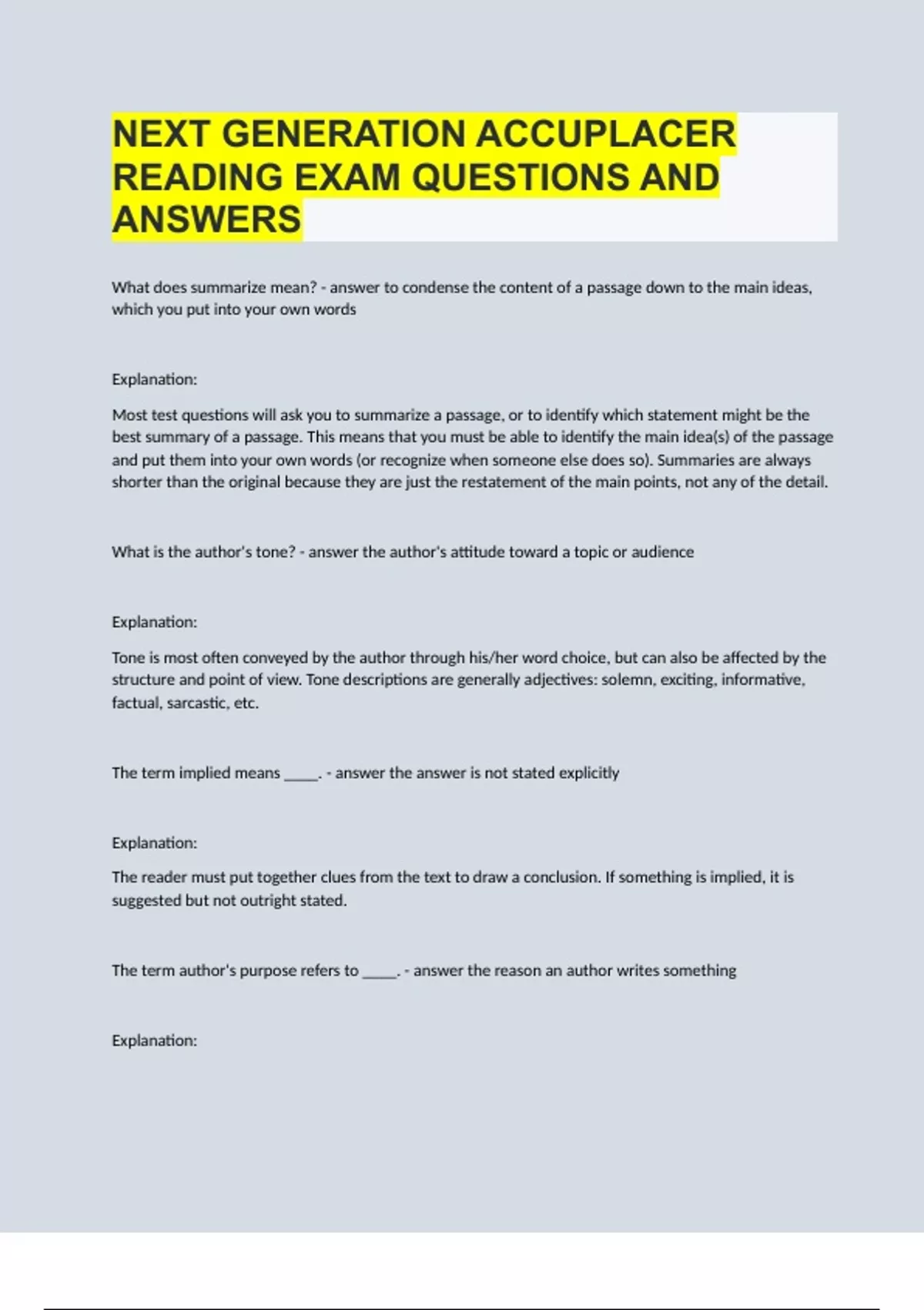 NEXT GENERATION ACCUPLACER READING EXAM QUESTIONS AND ANSWERS