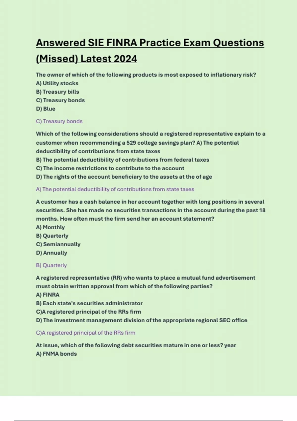 Answered SIE FINRA Practice (Missed) Exam Questions Latest 2024