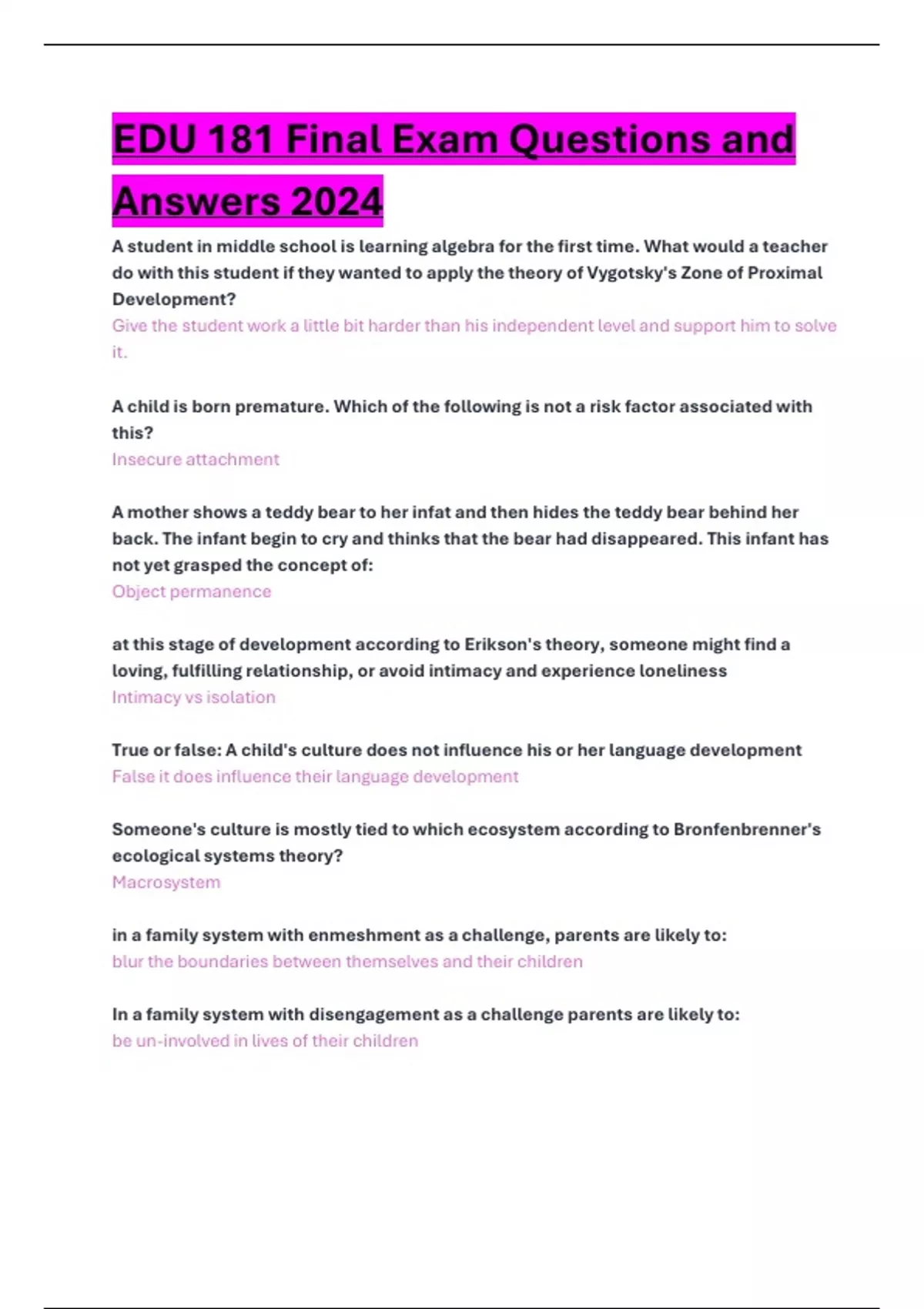 EDU 181 Final Exam Questions and Answers 2024
