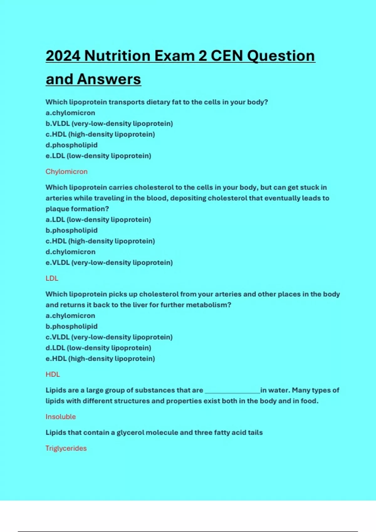 Latest Nutrition Exam 2 CEN Question and Answers 2024