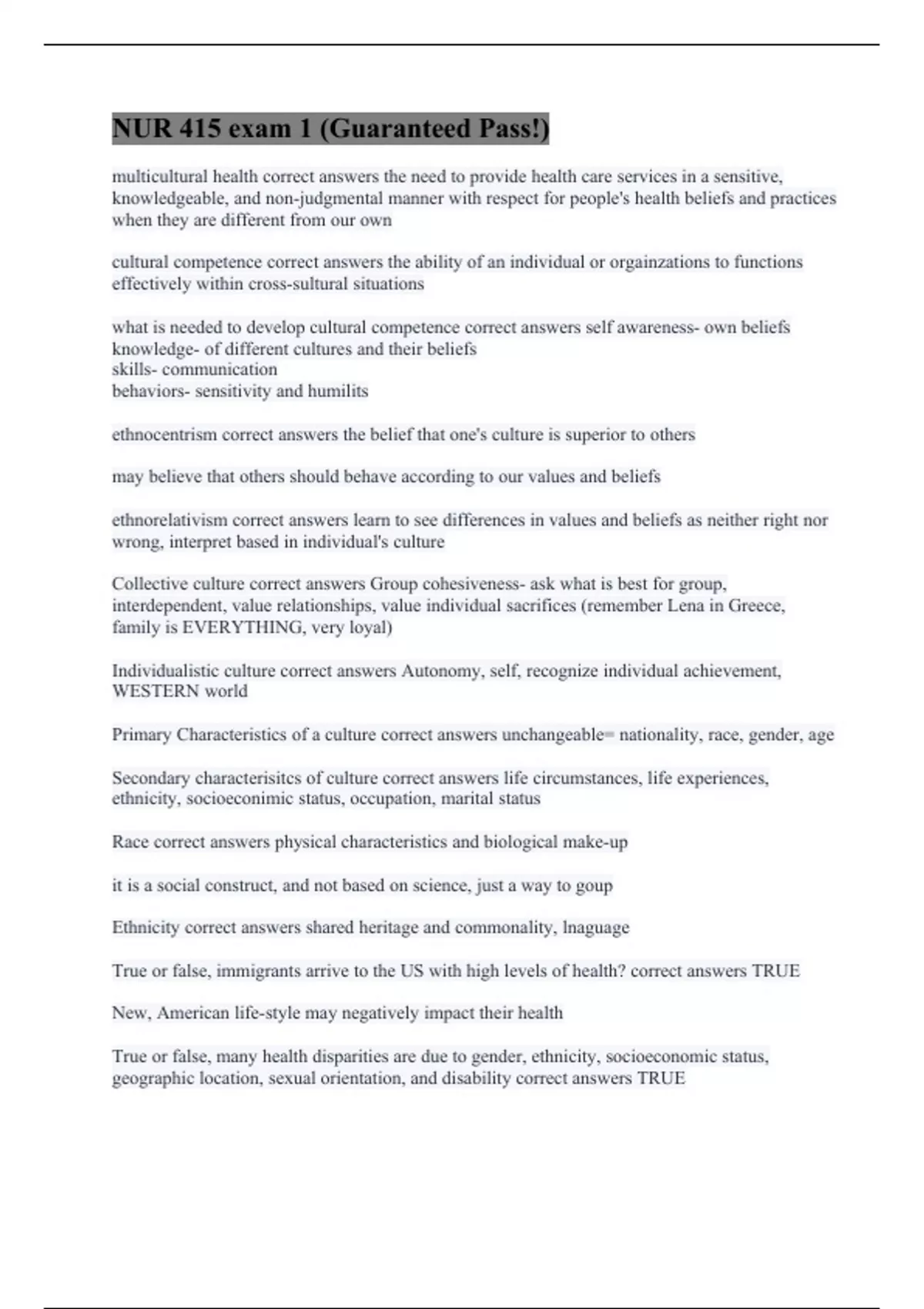 multicultural health correct answers the need to provide health care services in a sensitive, knowledgeable, and non-judgmental manner with respect for people's health beliefs and practices when they are different from our own cultural competence correct answers the ability of an individual or orgainzations to functions effectively within cross-sultural situations what is needed to develop cultural competence correct answers self awareness- own beliefs knowledge- of different cultures and their beliefs skills- communication behaviors- sensitivity and humilits ethnocentrism correct answers the belief that one's culture is superior to others may believe that others should behave according to our values and beliefs ethnorelativism correct answers learn to see differences in values and beliefs as neither right nor wrong, interpret based in individual's culture Collective culture correct answers Group cohesiveness- ask what is best for group, interdependent, value relationships, value individual sacrifices (remember Lena in Greece, family is EVERYTHING, very loyal) Individualistic culture correct answers Autonomy, self, recognize individual achievement, WESTERN world Primary Characteristics of a culture correct answers unchangeable= nationality, race, gender, age Secondary characterisitcs of culture correct answers life circumstances, life experiences, ethnicity, socioeconimic status, occupation, marital status Race correct answers physical characteristics and biological make-up it is a social construct, and not based on science, just a way to goup Ethnicity correct answers shared heritage and commonality, lnaguage True or false, immigrants arrive to the US with high levels of health? correct answers TRUE New, American life-style may negatively impact their health True or false, many health disparities are due to gender, ethnicity, socioeconomic status, geographic location, sexual orientation, and disability correct answers TRUE