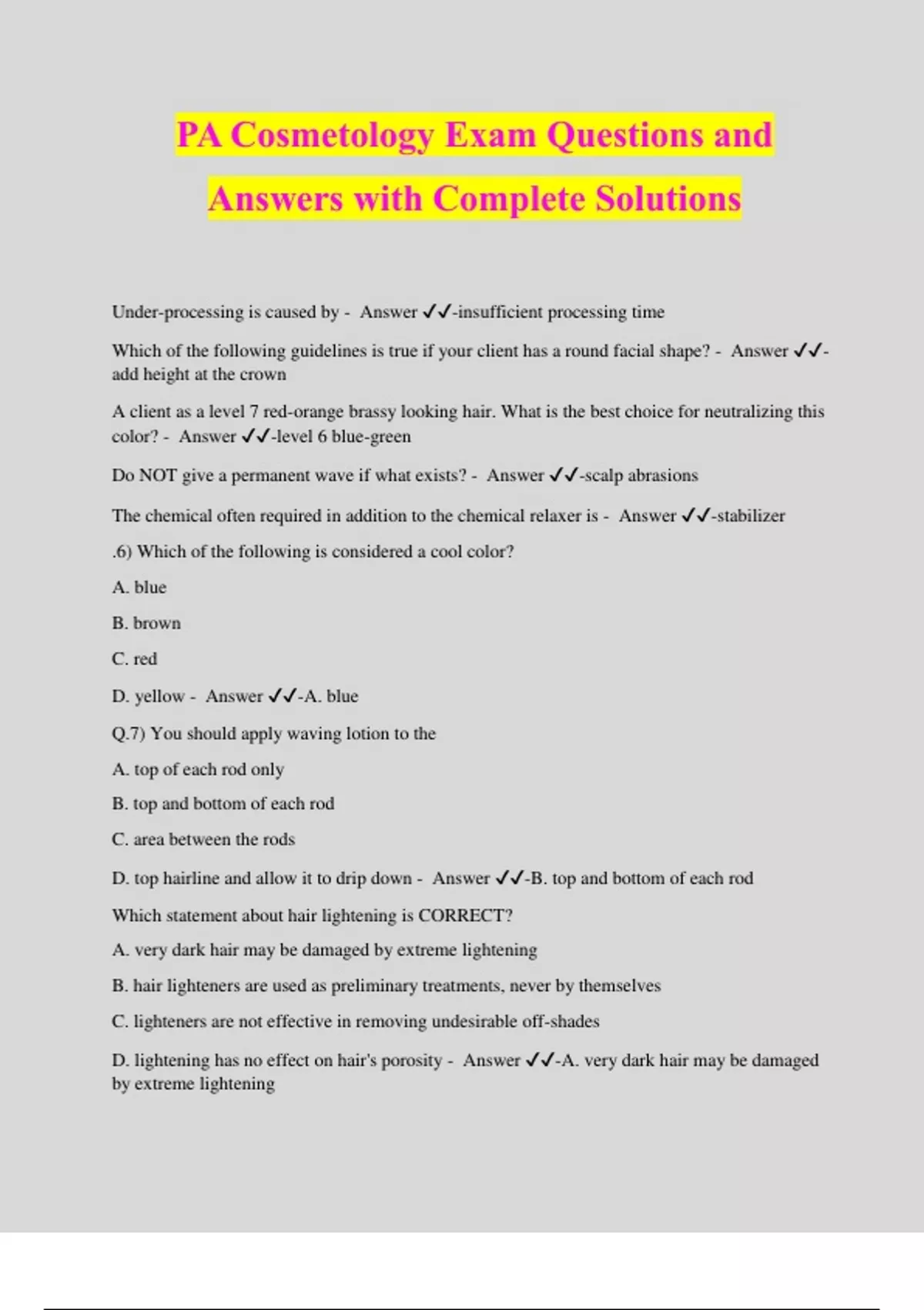 PA Cosmetology Exam Questions and Answers with Complete Solutions Under-processing is caused by - Answer ️️ -insufficient processing time Which of the following guidelines is true if your client has a round facial shape? - Answer ️️ - add height at the crown A client as a level 7 red-orange brassy looking hair. What is the best choice for neutralizing this color? - Answer ️️ -level 6 blue-green Do NOT give a permanent wave if what exists? - Answer ️️ -scalp abrasions The chemical often required in addition to the chemical relaxer is - Answer ️️ -stabilizer .6) Which of the following is considered a cool color? A. blue B. brown C. red D. yellow - Answer ️️ -A. blue Q.7) You should apply waving lotion to the A. top of each rod only B. top and bottom of each rod C. area between the rods D. top hairline and allow it to drip down - Answer ️️ -B. top and bottom of each rod Which statement about hair lightening is CORRECT? A. very dark hair may be damaged by extreme lightening B. hair lighteners are used as preliminary treatments, never by themselves C. lighteners are not effective in removing undesirable off-shades D. lightening has no effect on hair's porosity - Answer ️️ -A. very dark hair may be damaged by extreme lightening ) Which bonds are individually very weak? A. hydrogen B. salt C. disulfide D. both A and B - Answer ️️ -D. both A and B The relaxer cream is applied near the scalp last because processing is accelerated in this area by A. your speed in application B. the sebaceous glands C. body heat D. perspiration - Answer ️️ -C. body heat The haircut with a constant elevation of 90 degrees will result in A. a blunt cut with no layers B. graduation with added fullness at the crown C. layers that are all the same length D. layers with shorter lengths at the crown - Answer ️️ -C. layers that are all the same length Nail polish should be applied A. from the free edge to the base B. using light, sweeping strokes C. on the sides first D. all of the above - Answer ️️ -B. using light, sweeping strokes Hot oil manicures are partially effective on A. soft nails B. diseased nails C. brittle nails D. none of the above - Answer ️️ -C. brittle nails After rinsing the waving lotion from the hair, you should A. apply the neutralizer B. blow dry the hair C. set and style the hair D. blot off excess water - Answer ️️ -D. blot off excess water Your client will most likely accept suggestions about hair color services when you A. begin by explaining the prices of all your services B. base your suggestions on the client's needs and lifestyle C. carefully explain the underlying chemistry of hair coloring D. show the client color photos of movie stars with the same color - Answer ️️ -B. base your suggestions on the client's needs and lifestyle A client requests a style with no laters, but angled toward her face. Which elevation would you use? A. 180 degrees B. 90 degrees C. 45 degrees D. 0 degrees - Answer ️️ -D. 0 degrees Sebaceous glands are NOT found in which of the following areas of the skin A. forehead B. groin C. palms D. scalp - Answer ️️ -C. palms When you chemically relax a client's hair with a "no base" relaxer, you should always A. apply a protective cream to the entire scalp B. apply a protective cream to the hairline and ears C. make sure the hair is wet before beginning the procedure D. part the hair into no more than three sections - Answer ️️ -B.