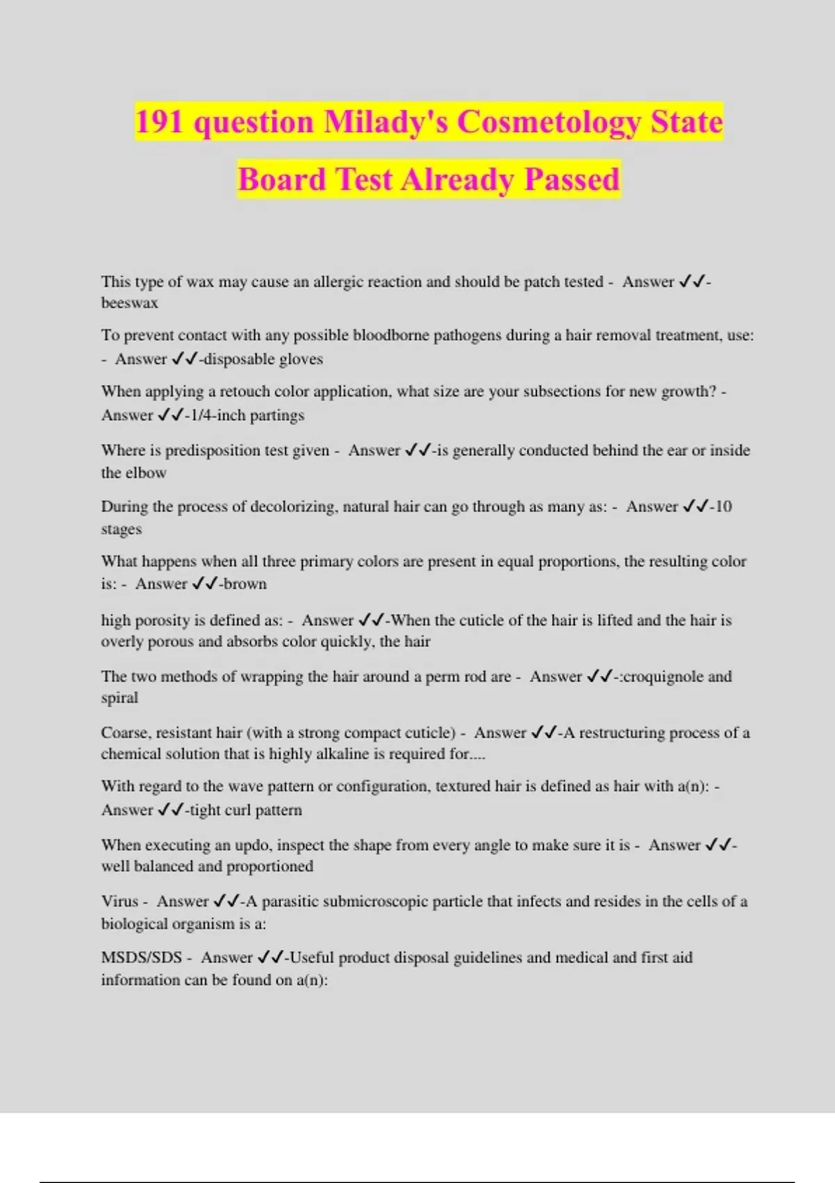 191 question Milady's Cosmetology State Board Test Already Passed This type of wax may cause an allergic reaction and should be patch tested - Answer ️️ - beeswax To prevent contact with any possible bloodborne pathogens during a hair removal treatment, use: - Answer ️️ -disposable gloves When applying a retouch color application, what size are your subsections for new growth? - Answer ️️ -1/4-inch partings Where is predisposition test given - Answer ️️ -is generally conducted behind the ear or inside the elbow During the process of decolorizing, natural hair can go through as many as: - Answer ️️ -10 stages What happens when all three primary colors are present in equal proportions, the resulting color is: - Answer ️️ -brown high porosity is defined as: - Answer ️️ -When the cuticle of the hair is lifted and the hair is overly porous and absorbs color quickly, the hair The two methods of wrapping the hair around a perm rod are - Answer ️️ -:croquignole and spiral Coarse, resistant hair (with a strong compact cuticle) - Answer ️️ -A restructuring process of a chemical solution that is highly alkaline is required for.... With regard to the wave pattern or configuration, textured hair is defined as hair with a(n): - Answer ️️ -tight curl pattern When executing an updo, inspect the shape from every angle to make sure it is - Answer ️️ - well balanced and proportioned Virus - Answer ️️ -A parasitic submicroscopic particle that infects and resides in the cells of a biological organism is a: MSDS/SDS - Answer ️️ -Useful product disposal guidelines and medical and first aid information can be found on a(n): Blood-borne pathogen - Answer ️️ -Disease-causing microorganisms that are carried in the body by blood or body fluids are called: tinea pedis - Answer ️️ -The most frequently encountered infection on the foot resulting from nail services is: acquired immunity - Answer ️️ -The type of immunity that the body develops after overcoming a disease or through inoculations is: efficacy - Answer ️️ -The term describing the effectiveness with which a disinfecting solution kills germs when used according to the label instructions is: quaternary ammonium compounds - Answer ️️ -A safe and useful type of disinfectant, commonly called quats, is: bleach - Answer ️️ -Sodium hypochlorite is the chemical name for: 20 seconds - Answer ️️ -What is the minium length of time you should hand wash? OSHA - Answer ️️ -Universal Precautions for bloodborne pathogens are regulated by cuticle layer - Answer ️️ -The epidermis layer of the skin is also known as the: stratum germinativum - Answer ️️ -The deepest layer of the epidermis, the basal cell layer, is also known as the arrector pili muscle - Answer ️️ -The muscle that causes goose bumps when a person is frightened or cold is the: reticular layer - Answer ️️ -The deeper layer of the dermis that supplies the skin with oxygen and nutrients is the: pheomelanin - Answer ️️ -The melanin produced by the body that is red to yellow in color elastin - Answer ️️ -The fibrous protein that gives skin its flexibility and helps skin regain its shape after being expanded sebaceous glands - Answer ️️ -Oil glands that are connected to hair follicles What is/ What does vitamin D do - Answer ️️ -enables the body to properly absorb and use calcium 50 to 70 percent - Answer ️️ -Water is the number one nutrient of the body and composes what percentage of the body's weight Lesion - Answer ️️ -Any mark on the skin bulla - Answer ️️ -A large blister containing a watery fluid is a: macule - Answer ️️ -A flat spot or discoloration on the skin pustule - Answer ️️ -An inflamed pimple containing pus tumor - Answer ️️ -An abnormal cell mass that varies in size, color, and shape fissure - Answer ️️ -Cracks in the skin that penetrate the dermis layer, such as chapped hands or lips keloid - Answer ️️ -A thick scar resulting from excessive growth of fibrous tissue ulcer - Answer ️️ -An open lesion of the skin or mucous membrane, accompanied by pus and characterized by loss of skin depth comedo - Answer ️️ -A hair follicle filled with keratin and sebum forms a milia - Answer ️️ -Benign, keratin-filled cysts that appear just under the epidermis and have no visible opening hyperhidrosis - Answer ️️ -Excessive sweating, caused by heat or general body weakness herpes simplex - Answer ️️ -A contagious, recurring viral infection characterized by fever blisters or cold sores psoriasis - Answer ️️ -A noncontagious sk