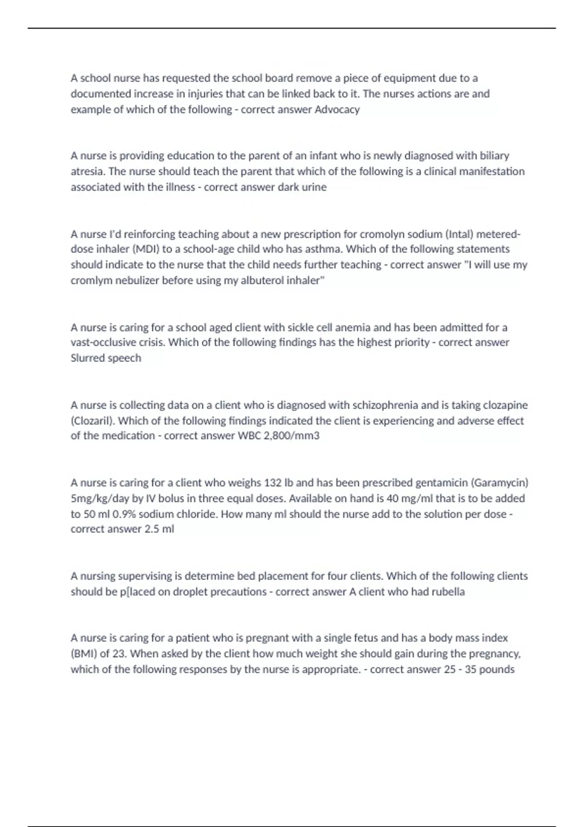 A school nurse has requested the school board remove a piece of equipment due to a documented increase in injuries that can be linked back to it. The nurses actions are and example of which of the following - correct answer Advocacy A nurse is providing education to the parent of an infant who is newly diagnosed with biliary atresia. The nurse should teach the parent that which of the following is a clinical manifestation associated with the illness - correct answer dark urine
