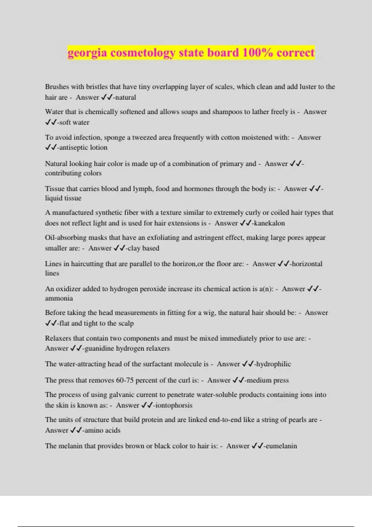 georgia cosmetology state board 100% correct Brushes with bristles that have tiny overlapping layer of scales, which clean and add luster to the hair are - Answer ️️ -natural Water that is chemically softened and allows soaps and shampoos to lather freely is - Answer ️️ -soft water To avoid infection, sponge a tweezed area frequently with cotton moistened with: - Answer ️️ -antiseptic lotion Natural looking hair color is made up of a combination of primary and - Answer ️️ - contributing colors Tissue that carries blood and lymph, food and hormones through the body is: - Answer ️️ - liquid tissue A manufactured synthetic fiber with a texture similar to extremely curly or coiled hair types that does not reflect light and is used for hair extensions is - Answer ️️ -kanekalon Oil-absorbing masks that have an exfoliating and astringent effect, making large pores appear smaller are: - Answer ️️ -clay based Lines in haircutting that are parallel to the horizon,or the floor are: - Answer ️️ -horizontal lines An oxidizer added to hydrogen peroxide increase its chemical action is a(n): - Answer ️️ - ammonia Before taking the head measurements in fitting for a wig, the natural hair should be: - Answer ️️ -flat and tight to the scalp Relaxers that contain two components and must be mixed immediately prior to use are: - Answer ️️ -guanidine hydrogen relaxers The water-attracting head of the surfactant molecule is - Answer ️️ -hydrophilic The press that removes 60-75 percent of the curl is: - Answer ️️ -medium press The process of using galvanic current to penetrate water-soluble products containing ions into the skin is known as: - Answer ️️ -iontophorsis The units of structure that build protein and are linked end-to-end like a string of pearls are - Answer ️️ -amino acids The melanin that provides brown or black color to hair is: - Answer ️️ -eumelanin The cortex is responsible for the natural color of hair, 90 percent of the total weight, and hair - Answer ️️ -elasticity Nonpathogenic bacteria are: - Answer ️️ -harmless Before giving a chemical wave, the hair should be: - Answer ️️ -analyzed and shampooed A coiled, corkscrew shaped bacteria cell that causes syphilis and cholera is - Answer ️️ - spirillia If a temporary color rinse is applied to normal hair, it will - Answer ️️ -coat the cuticle Which instrument should be used to slither a client's hair? - Answer ️️ -shears Why is it necessary to use a conditioner-filler during a chemical relaxer retouch service? - Answer ️️ -helps even the porosity Which of the following is the peak of a finger wave - Answer ️️ -ridge What is made of cells, blood, calcium carbonate, and calcium phosphate? - Answer ️️ -bones Disulfide bonds are broken by the - Answer ️️ -chemical waving solution A client with which of the following nail conditions should be referred to a physician? - Answer ️️ -onychomychosis fungis of nails The shortest processing time in chemical waving is usually required for hair which is - Answer ️️ -lightened When tinting lightened hair back to its natural shade, it is necessary to - Answer ️️ -apply a filler High elevation in haircutting is used to - Answer ️️ -create layers function of keratin - Answer ️️ -forms base of all horny tissue Which should be used to stop the bleeding of a minor cut during a manicure? - Answer ️️ - alum powder What is formed when two or more non-mixable substances are united with the help of a binder or gum- like substance? - Answer ️️ -emulsion - a fine dispersion of minute droplets of one liquid in another in which it is not soluble or miscible. To remove lightener, hair should be rinsed in water that is - Answer ️️ -tepid luke warm tube-like pocket that contains the hair - Answer ️️ -follicle The mobility of a pin curl is determined by the - Answer ️️ -st