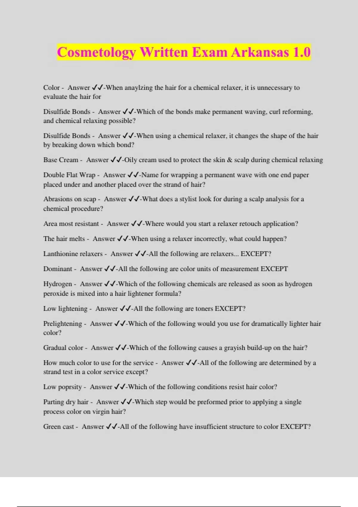 Cosmetology Written Exam Arkansas 1.0 Color - Answer ️️ -When anaylzing the hair for a chemical relaxer, it is unnecessary to evaluate the hair for Disulfide Bonds - Answer ️️ -Which of the bonds make permanent waving, curl reforming, and chemical relaxing possible? Disulfide Bonds - Answer ️️ -When using a chemical relaxer, it changes the shape of the hair by breaking down which bond? Base Cream - Answer ️️ -Oily cream used to protect the skin & scalp during chemical relaxing Double Flat Wrap - Answer ️️ -Name for wrapping a permanent wave with one end paper placed under and another placed over the strand of hair? Abrasions on scap - Answer ️️ -What does a stylist look for during a scalp analysis for a chemical procedure? Area most resistant - Answer ️️ -Where would you start a relaxer retouch application? The hair melts - Answer ️️ -When using a relaxer incorrectly, what could happen? Lanthionine relaxers - Answer ️️ -All the following are relaxers... EXCEPT? Dominant - Answer ️️ -All the following are color units of measurement EXCEPT Hydrogen - Answer ️️ -Which of the following chemicals are released as soon as hydrogen peroxide is mixed into a hair lightener formula? Low lightening - Answer ️️ -All the following are toners EXCEPT? Prelightening - Answer ️️ -Which of the following would you use for dramatically lighter hair color? Gradual color - Answer ️️ -Which of the following causes a grayish build-up on the hair? How much color to use for the service - Answer ️️ -All of the following are determined by a strand test in a color service except? Low poprsity - Answer ️️ -Which of the following conditions resist hair color? Parting dry hair - Answer ️️ -Which step would be preformed prior to applying a single process color on virgin hair? Green cast - Answer ️️ -All of the following have insufficient structure to color EXCEPT? A Virucide, Fungicide, bactericide, and disinfectant - Answer ️️ -Which of the following are the qualifications o be an EPA approved disinfectant? Universal precautions - Answer ️️ -Where do the guidelines for human blood and body fluids come from? Using - Answer ️️ -All of the following are addressed by OSHA's standards for products EXCEPT? Occipitalis pinch - Answer ️️ -When you muscles become fatigued durning a service, you client will benefit from all of the following EXCEPT? Heart Attack - Answer ️️ -Preventative Ergonomics prevents all the following except? Travels in two direction - Answer ️️ -Which of the following describes the path of an alternating electrical current in devices such as hair dryers and curling irons? Shaving or cutting the hair has no effect on hair growth - Answer ️️ -Which of the following is true for normal hair growth? Density - Answer ️️ -The number of individual hair strands on 1 square inch of scalp Catagen phase - Answer ️️ -Brief transition period between the growth and resting phases of a hair follicle Hair bulb - Answer ️️ -Lowest part of the hai