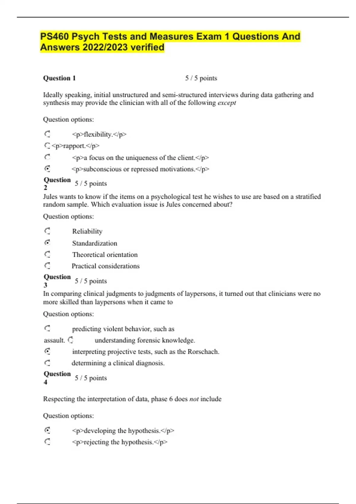 PS460 Psych Tests and Measures Exam 1 Questions And Answers 2022/2023 verified Question 1 5 / 5 points Ideally speaking, initial unstructured and semi-structured interviews during data gathering and synthesis may provide the clinician with all of the following except Question options: <p>flexibility.</p> <p>rapport.</p> <p>a focus on the uniqueness of the client.</p> <p>subconscious or repressed motivations.</p> Question 2 5 / 5 points Jules wants to know if the items on a psychological test he wishes to use are based on a stratified random sample. Which evaluation issue is Jules concerned about? Question options: Reliability Standardization Theoretical orientation Practical considerations Question 3 5 / 5 points In comparing clinical judgments to judgments of laypersons, it turned out that clinicians were no more skilled than laypersons when it came to Question options: predicting violent behavior, such as assault. understanding forensic knowledge. interpreting projective tests, such as the Rorschach. determining a clinical diagnosis. Question 4 5 / 5 points Respecting the interpretation of data, phase 6 does not include Question options: <p>developing the hypothesis.</p> <p>rejecting the hypothesis.</p> Question 5 <p>accepting the hypothesis.</p> <p>modifying the hypothesis</p> 0 / 5 points The best technique for determining internal consistency of a trait that manifests a high degree of fluctuation is Question options: <p>test-retest.</p> <p>alternate forms.</p> <p>inter-scorer reliability.</p> <p>split-half reliability.</p> Question 6 5 / 5 points Which of these describes the earliest form of psychological assessment? Question options: Unstructured interviews Structured interviews Unstructured interaction Diagnostic analyses Question 7 5 / 5 points A series of tests, called a(n) , is believed to provide a total picture of a person. Question options: test bank trait profile test battery trait comparison Question 8 0 / 5 points Instructor Miles looks over Test Q and feels it will measure mechanical aptitude; in other words, the instructor believes the test has