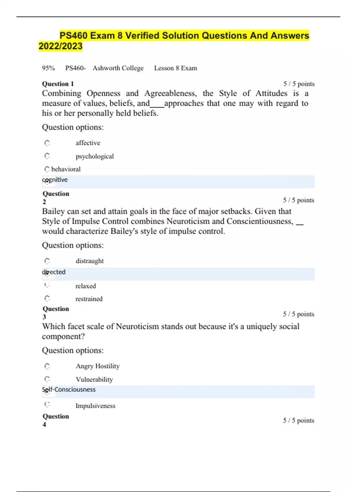 PS460 Exam 8 Verified Solution Questions And Answers 2022/2023 95% PS460- Ashworth College Lesson 8 Exam Question 1 5 / 5 points Combining Openness and Agreeableness, the Style of Attitudes is a measure of values, beliefs, and approaches that one may with regard to his or her personally held beliefs. Question options: affective psychological behavioral Question 2 5 / 5 points Bailey can set and attain goals in the face of major setbacks. Given that Style of Impulse Control combines Neuroticism and Conscientiousness, would characterize Bailey's style of impulse control. Question options: distraught Question 3 relaxed restrained 5 / 5 points Which facet scale of Neuroticism stands out because it's a uniquely social component? Question options: Angry Hostility Vulnerability Question 4 Impulsiveness 5 / 5 points Researchers have determined that the NEO Personality Inventory Big Five are across human cultures. Question options: Question 5 inconsistent invisible differentiated 5 / 5 points Which statement is true when comparing the MMPI, MCIM, and NEO tests? Question options: <p>All three tests can be appropriately administered to normal people.</p> <p>The MMPI focuses on pathology but is often applicable to normal people.</p> <p>The MCIM focuses on pathology but is often applicable to normal people.</p> Question 6 5 / 5 points The NEO-PI-R was standardized on the basis of 500 males and 500 females, while categories like age and ethnicity were aligned with data from the U.S. Census Bureau. What was the main criticism of this normative sample? Question options: The sample was not representative of the actual proportions of males to females. Question 7 The sample was not representative of the actual proportions of adolescents to adults. The education level of the sample was lower than that found in the general population. 5 / 5 points In the NEO, the Big Five and the facet scales are expected to follow a(n) Question options: