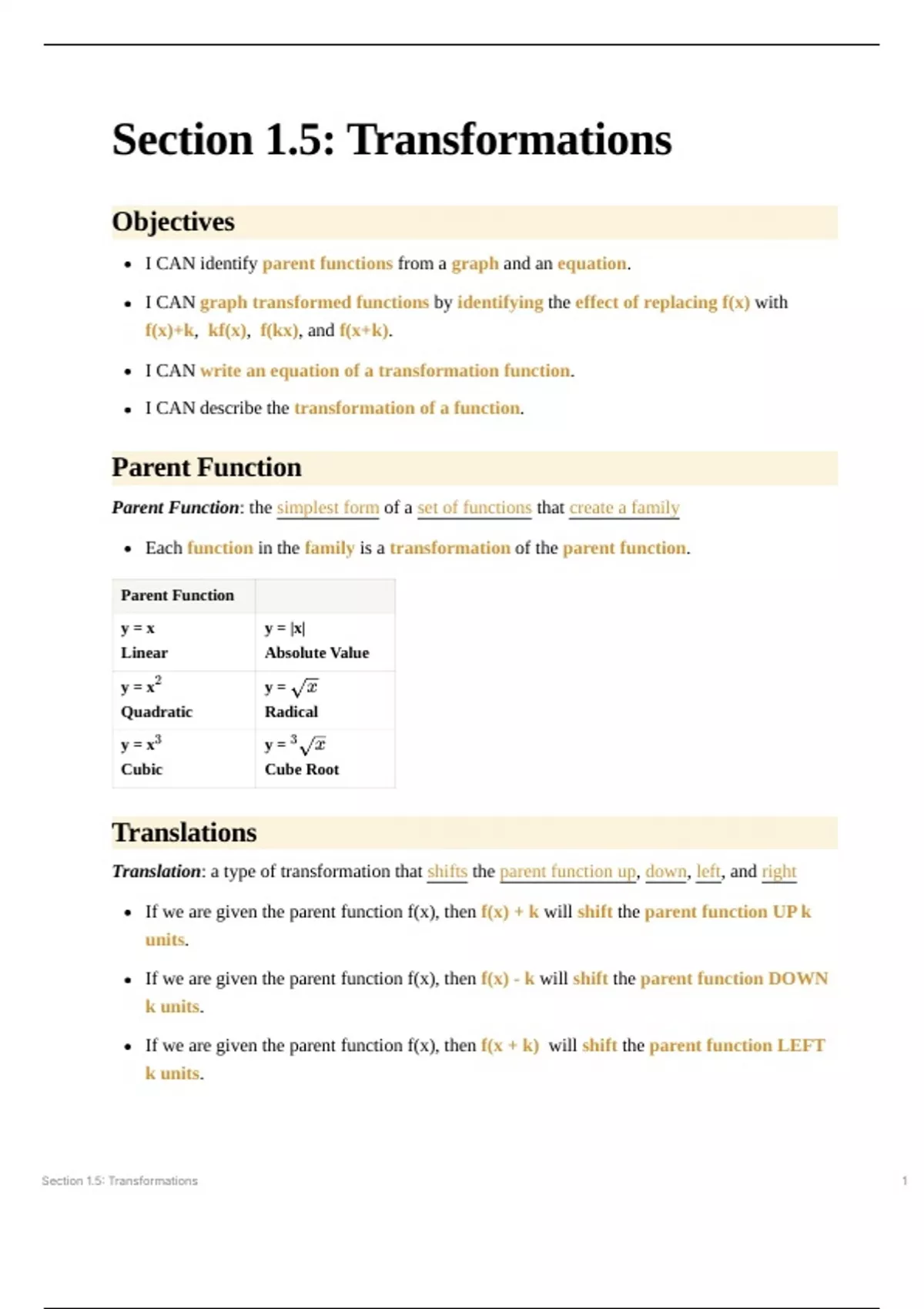 After these notes, you will know how to: Identify parent functions from a graph and an equation. Graph transformed functions by identifying the effect of replacing f(x) with f(x)+k, kf(x), f(kx), and f(x+k). Write an equation of a transformation function. Describe the transformation of a function.