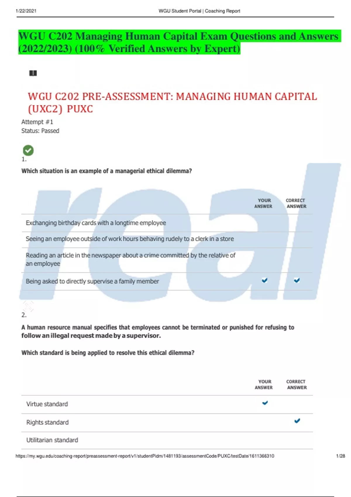 WGU C202 Managing Human Capital Exam Questions and Answers (2022/2023) (100% Verified Answers by WGU C202 PRE-ASSESSMENT: MANAGING HUMAN CAPITAL