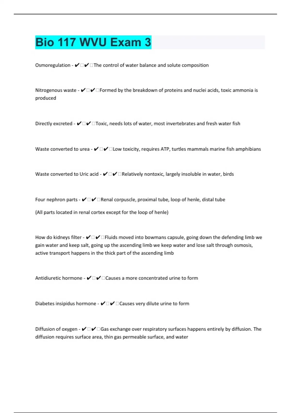 Osmoregulation - ️️The control of water balance and solute composition Nitrogenous waste - ️️Formed by the breakdown of proteins and nuclei acids, toxic ammonia is produced Directly excreted - ️️Toxic, needs lots of water, most invertebrates and fresh water fish Waste converted to urea - ️️Low toxicity, requires ATP, turtles mammals marine fish amphibians Waste converted to Uric acid - ️️Relatively nontoxic, largely insoluble in water, birds Four nephron parts - ️️Renal corpuscle, proximal tube, loop of henle, distal tube (All parts located in renal cortex except for the loop of henle) How do kidneys filter - ️️Fluids moved into bowmans capsule, going down the defending limb we gain water and keep salt, going up the ascending limb we keep water and lose salt through osmosis, active transport happens in the thick part of the ascending limb Antidiuretic hormone - ️️Causes a more concentrated urine to form Diabetes insipidus hormone - ️️Causes very dilute urine to form Diffusion of oxygen - ️️Gas exchange over respiratory surfaces happens entirely by diffusion. The diffusion requires surface area, thin gas permeable surface, and water