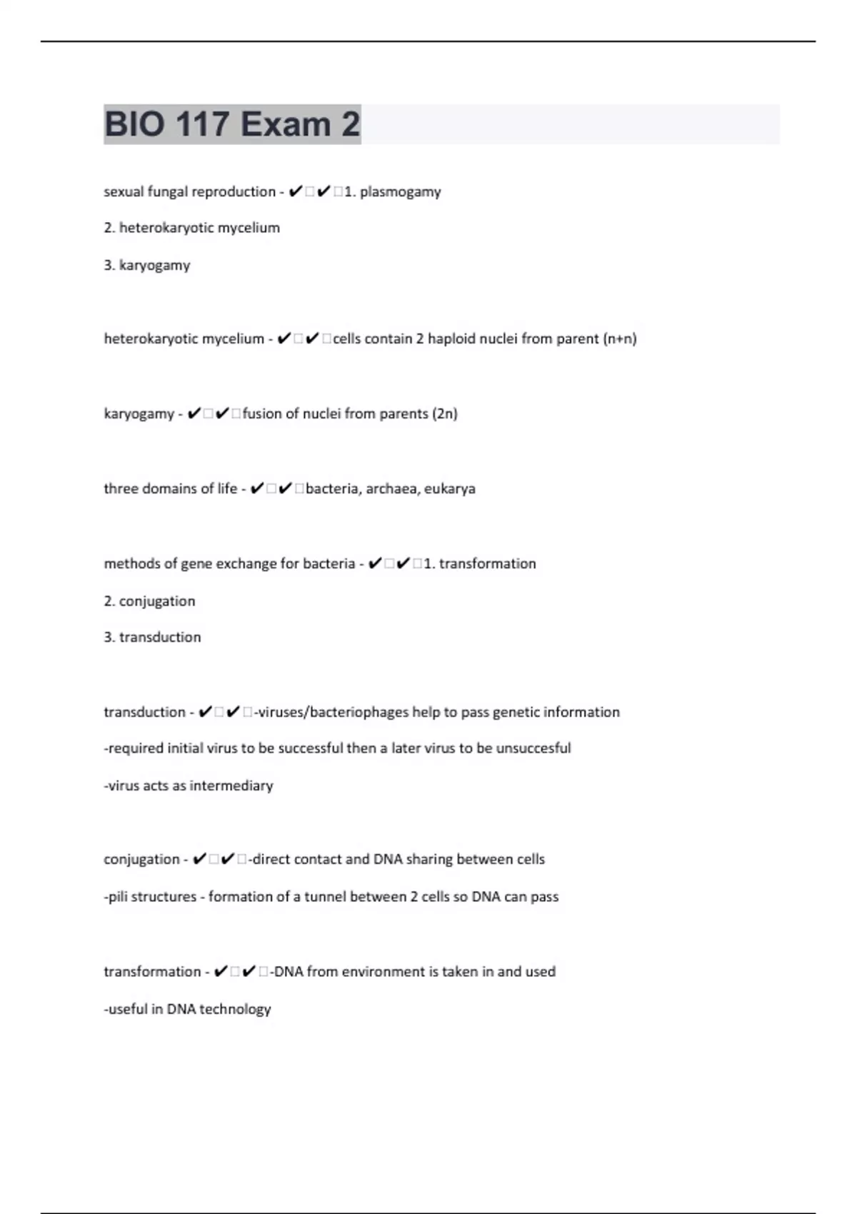 sexual fungal reproduction - ️️1. plasmogamy 2. heterokaryotic mycelium 3. karyogamy heterokaryotic mycelium - ️️cells contain 2 haploid nuclei from parent (n+n) karyogamy - ️️fusion of nuclei from parents (2n) three domains of life - ️️bacteria, archaea, eukarya methods of gene exchange for bacteria - ️️1. transformation 2. conjugation 3. transduction transduction - ️️-viruses/bacteriophages help to pass genetic information -required initial virus to be successful then a later virus to be unsuccesful -virus acts as intermediary conjugation - ️️-direct contact and DNA sharing between cells -pili structures - formation of a tunnel between 2 cells so DNA can pass transformation - ️️-DNA from environment is taken in and used -useful in DNA technology