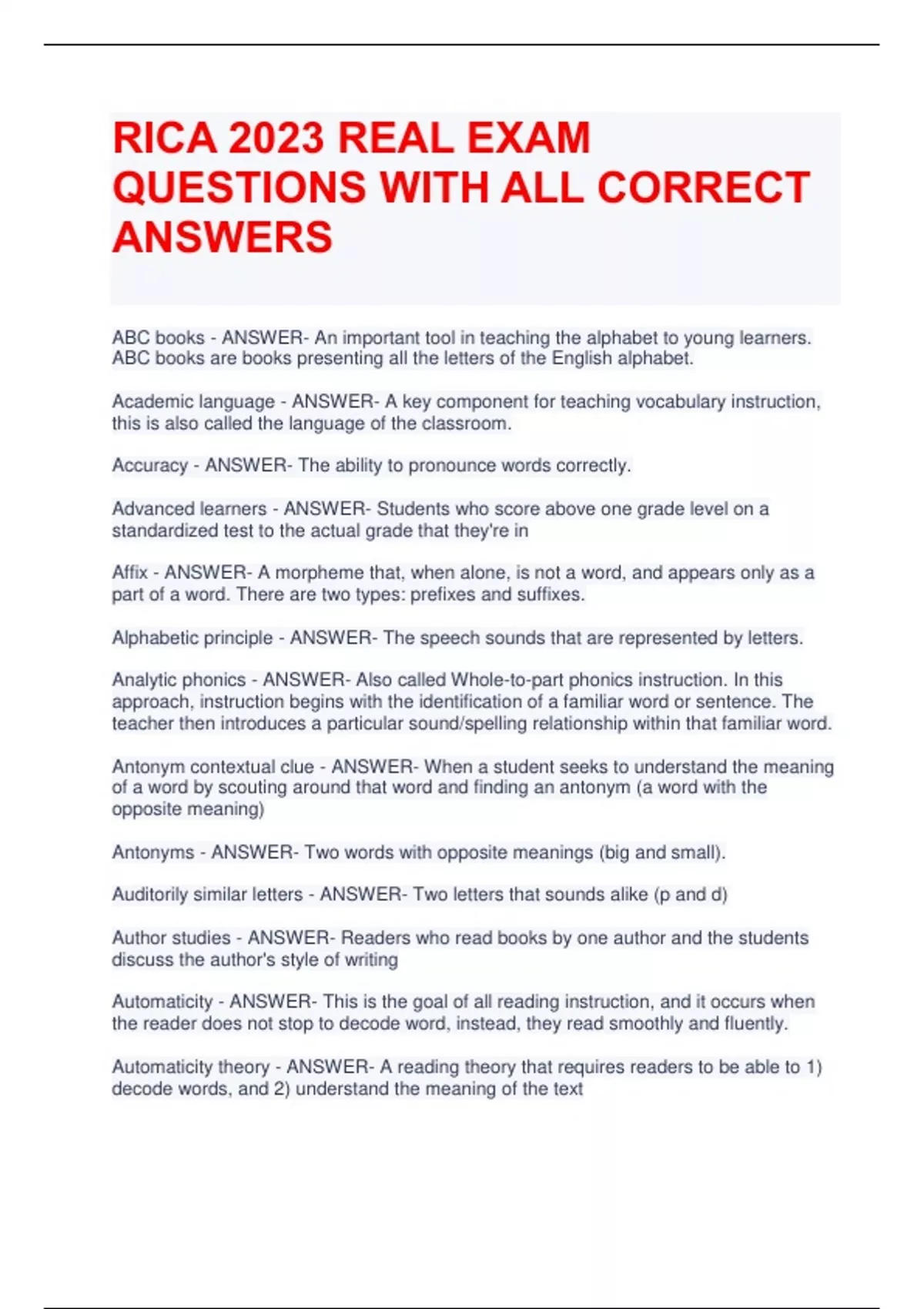 RICA 2023 REAL EXAM QUESTIONS WITH ALL CORRECT ANSWERS ABC books - ANSWER- An important tool in teaching the alphabet to young learners. ABC books are books presenting all the letters of the English alphabet. Academic language - ANSWER- A key component for teaching vocabulary instruction, this is also called the language of the classroom. Accuracy - ANSWER- The ability to pronounce words correctly. Advanced learners - ANSWER- Students who score above one grade level on a standardized test to the actual grade that they're in Affix - ANSWER- A morpheme that, when alone, is not a word, and appears only as a part of a word. There are two types: prefixes and suffixes. Alphabetic principle - ANSWER- The speech sounds that are represented by letters. Analytic phonics - ANSWER- Also called Whole-to-part phonics instruction. In this approach, instruction begins with the identification of a familiar word or sentence. The teacher then introduces a particular sound/spelling relationship within that familiar word. Antonym contextual clue - ANSWER- When a student seeks to understand the meaning of a word by scouting around that word and finding an antonym (a word with the opposite meaning) Antonyms - ANSWER- Two words with opposite meanings (big and small). Auditorily similar letters - ANSWER- Two letters that sounds alike (p and d) Author studies - ANSWER- Readers who read books by one author and the students discuss the author's style of writing Automaticity - ANSWER- This is the goal of all reading instruction, and it occurs when the reader does not stop to decode word, instead, they read smoothly and fluently. Automaticity theory - ANSWER- A reading theory that requires readers to be able to 1) decode words, and 2) understand the meaning of the text Background knowledge - ANSWER- All that a person knows about a topic Balanced instructional program in reading - ANSWER- A reading program that provides a mixture of direct reading instruction and strategies with opportunities for students to practice. This kind of instructional reading program is one that has these three things: 1) instructional materials (texts and assessments), 2) reading skills and strategies students are expected to masters, 3) instructional strategies to teach these skills and strategies Basal reading programs - ANSWER- A commercially produced package of instructional materials used to teach children to read, using graduated sets of reading texts Blends - ANSWER- Two- or three-letter combinations of consonants that are pronounced together to make a sound. (bl in blend) Book club - ANSWER- A group of students reading the same book at the same pace Bound morpheme - ANSWER- An affix that only exists when attached to a word (pre in pretest) Cause and effect - ANSWER- A text structure used in expository texts to show how one phenomenon results from another phenomenon Character - ANSWER- The who of the story- in children's books, characters can be people, but also animals, plants, and inanimate objects Closed syllable - ANSWER- A syllable that ends with a consonant Cognates - ANSWER- Two words from different language that have similar spellings and meanings Compare and contrast - ANSWER- An expository text structure frequently used to describe the differences, and even similarities (using a Venn diagram) of a place, person, or thing Complex sentence - ANSWER- A type of sentence that has one independent clause and one dependent clause, and are linked with the words, because, since, after, although, when, that, who, or which (Fred kicked the football to Sam, who kicked it over the fence.) Compound sentence - ANSWER- A type of sentence that has two independent clauses and are joined by words that include, and, nor, but, yet, and so (Fred kicked the football and Sally played on the swings.) Comprehension - ANSWER- Having an understanding of what was just read Comprehensive reading program - ANSWER- A reading program structured so that all grade-level standards are covered Concepts about print (CAP) - ANSWER- A key component to kindergartener's reading instruction, These are the essential principals and formats of letters, words, and sentences in a written language. There are four main areas of CAP. These include, 1) understanding that print carries meaning and that there is a relationship between spoken and written English 2) the ability to recognize the differences between letters 3) the directionality of print (left to right and top to bottom) 4) book handling skills Concepts about print test - ANSWER- A test that measures a child's mastery of concepts about print Concrete examples - ANSWER- Using real things in a lesson to show, demonstrate and teach the meaning of the word (banana) Consonants - ANSWER- Speech sounds that occur when the airflow is obstructed in some way by our mouth, te