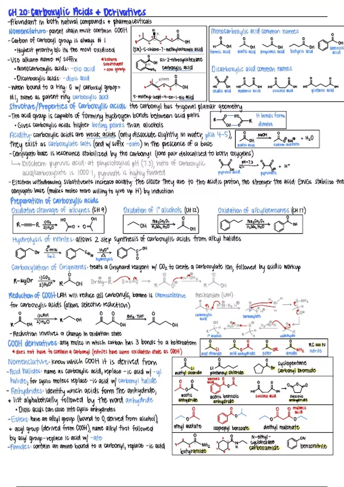 Discusses nomenclature, reactions and mechanisms of carboxylic acids and their derivatives. This includes nitriles, amides, acyl halides, esters and anhydrides. Goes over preparation and reaction of all derivatives, as well as their relative reactivity.