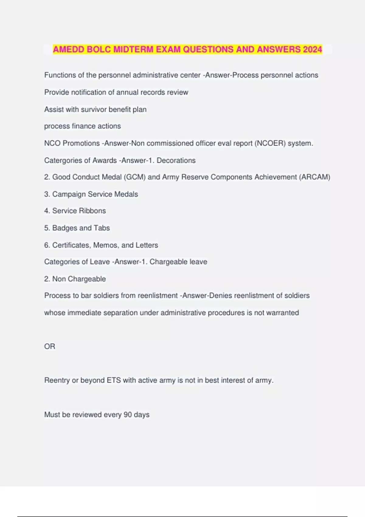 AMEDD BOLC MIDTERM EXAM QUESTIONS AND ANSWERS 2024 Functions of the personnel administrative center -Answer-Process personnel actions Provide notification of annual records review Assist with survivor benefit plan process finance actions NCO Promotions -Answer-Non commissioned officer eval report (NCOER) system. Catergories of Awards -Answer-1. Decorations 2. Good Conduct Medal (GCM) and Army Reserve Components Achievement (ARCAM) 3. Campaign Service Medals 4. Service Ribbons 5. Badges and Tabs 6. Certificates, Memos, and Letters Categories of Leave -Answer-1. Chargeable leave 2. Non Chargeable Process to bar soldiers from reenlistment -Answer-Denies reenlistment of soldiers whose immediate separation under administrative procedures is not warranted OR Reentry or beyond ETS with active army is not in best interest of army. Must be reviewed every 90 days Reasons: - AWOL - Pattern of being late - overweight - lots of article 15's - loss of equipment - allergic to the army types of enlisted promotion systems -Answer- suspension of favorable personnel action (FLAGS) -Answer-FLAG: guards against the accidental execution of specified favorable personnel actions for soldiers not in good standing. There are transferable (AFPT/ht wt/ punishment phase of adverse action) and non-transferable flags (AWOL/ investigation/ drug alc/ failure to maintain adequate Family Care Plan. What is chargeable leave? -Answer-absence that is subtracted from accrued leave balabce What are ex of chargeable leave? -Answer-ordinary, transition, emergency, PCS, Leave in conjunction with TDY Non-chargeable leave? -Answer-absence that is not charged against accrued leave balance What are ex of non-chargeable leave? -Answer-convalescent, PTDY, excess, regular pass (no more than 3 days), special pass (3-4 days) Different levels of leadership -Answer-1. Direct 2. Organizational 3. Strategic Methods of providing developmental feedback to subordinates -Answer-1. Counseling 2. Coaching 3. Mentoring Attributes and Army leadership -Answer-A leader of character 2. A leader with presence 3. A leader with intellectual capacity Competencies of Army Leadership -Answer-1. An Army leader leads 2. An Army leader develops 3. An Army leader achieves. Ways to provide developmental feedback -Answer-1. Event counseling 2. Performance counseling 3. Professional growth counseling Types of Counseling -Answer-1. Event counseling 2. Performance counseling 3. Professional growth counseling Approaches to Counseling -Answer-1. Non-directive (preferred) - use experiences, partially structured, time intensive 2. Directive - tell subordinate what to do and wh