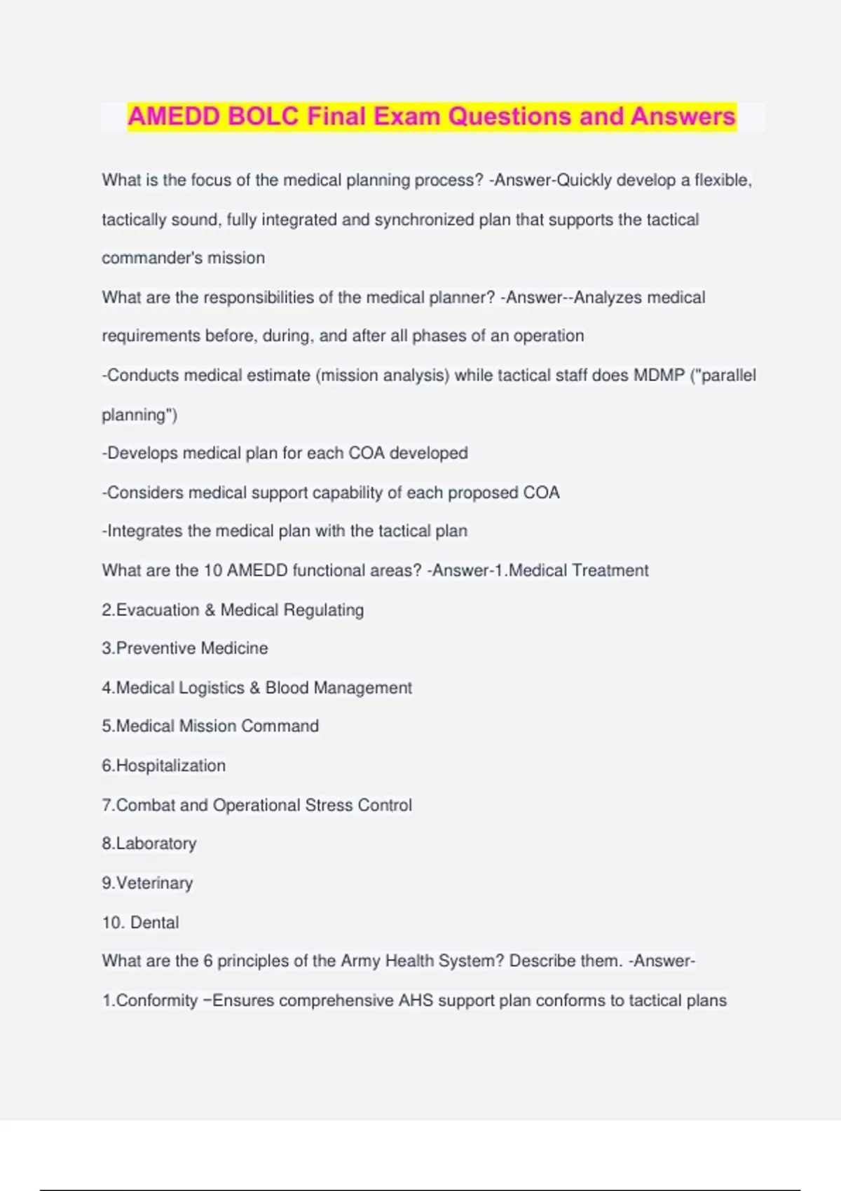 AMEDD BOLC Final Exam Questions and Answers What is the focus of the medical planning process? -Answer-Quickly develop a flexible, tactically sound, fully integrated and synchronized plan that supports the tactical commander's mission What are the responsibilities of the medical planner? -Answer--Analyzes medical requirements before, during, and after all phases of an operation -Conducts medical estimate (mission analysis) while tactical staff does MDMP ("parallel planning") -Develops medical plan for each COA developed -Considers medical support capability of each proposed COA -Integrates the medical plan with the tactical plan What are the 10 AMEDD functional areas? -Answer-1.Medical Treatment 2.Evacuation & Medical Regulating 3.Preventive Medicine 4.Medical Logistics & Blood Management 5.Medical Mission Command 6.Hospitalization 7.Combat and Operational Stress Control 8.Laboratory 9.Veterinary 10. Dental What are the 6 principles of the Army Health System? Describe them. -Answer- 1.Conformity −Ensures comprehensive AHS support plan conforms to tactical plans −Medical assets are placed on the battlefield properly 2.Proximity−Provide medical support at the right time and place −Medical resources used as far forward as possible, without impeding operations 3.Flexibility−Ability to shift AHS resources to meet changing battlefield requirements −Effectively managing medical resources to benefit greatest number of Soldiers in AO 4.Mobility−AHS assets remain in supporting distance to support maneuvering forces -Vehicle hardening equal to that of supported unit 5.Continuity−Patient moves through progressive, phased roles of care −Each Soldier gets care required to optimize outcome 6.Control−Resources efficiently employed −Ensure scope and quality of medical treatment meets professional standards and policies What is a medical estimate? -Answer-A continuous process which systematically examines all aspects of operations -Produces task organization for decentralized execution and flexible medical support on the battlefield The main purpose of medical analysis should be to examine what seven areas? - Answer-1)Enemy situation 2)Friendly situation 3)Characteristics of the Area of Responsibility (AOR) 4)Strengths to be supported 5)Health of the command 6)Facts and Assumptions 7)Specified, Implied, and Essential Tasks What is analyzed in the Enemy Situation area of medical analysis? -Answer--Strength and location -Combat efficiency -Capabilities -Logistics -EPW casualty estimate What is analyzed in the Friendly Situation area of medical analysis? -Answer--Strength and disposition -Combat efficiency -Rear battle plan -Weapon systems What is analyzed in the Characteristics of AOR area of medical analysis? -Answer-- Terrain - Obstacles, Avenues of Approach, Key Terrain, Observation and Fields of Fire, Cover and Concealment (OAKOC) -Weather -Flora and fauna What is analyzed in the Strengths to be Supported area of medical analysis? -Answer- Medical requirements for: Joint Services Allied Forces Coalition Forces Refugees Civilian population of Host Nation Enemy Prisoner of War (EPW) population Department of Defense (DOD) personnel What is analyzed in the Health of the Command area of medical analysis? -Answer- Medical Readiness of the Soldier includes: Immunizations Acclimatization Nutrition Fatigue (sleep) Combat and Operational Stress Dental Status What is analyzed in the Facts and Assumptions area of medical analysis? -Answer- Areas to consider in absence of Facts: Host Nation support Resupply rates Use of weapons of mass destruction Time-frame of operation Status of evacuation routes Who does casualty estimates? -Answer-S-1 •Killed in Action (KIA) •Wounded in Action (WIA) •Missing in Action (MIA) Who refines/analyzes the casualty estimate? What is included? -Answer-The Medical Planner