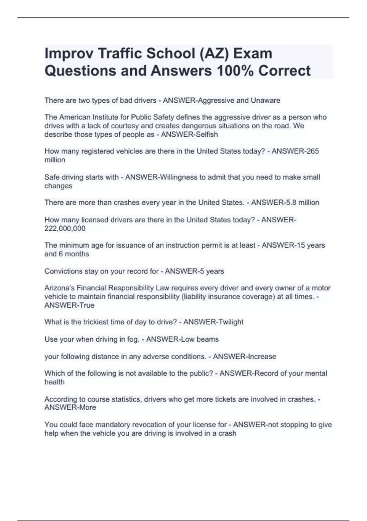 Improv Traffic School (AZ) Exam Questions and Answers 100% Correct Improv Traffic School (AZ) Exam Questions and Answers 100% Correct Improv Traffic School (AZ) Exam Questions and Answers 100% Correct There are two types of bad drivers - ANSWER-Aggressive and Unaware The American Institute for Public Safety defines the aggressive driver as a person who drives with a lack of courtesy and creates dangerous situations on the road. We describe those types of people as - ANSWER-Selfish How many registered vehicles are there in the United States today? - ANSWER-265 million Safe driving starts with - ANSWER-Willingness to admit that you need to make small changes