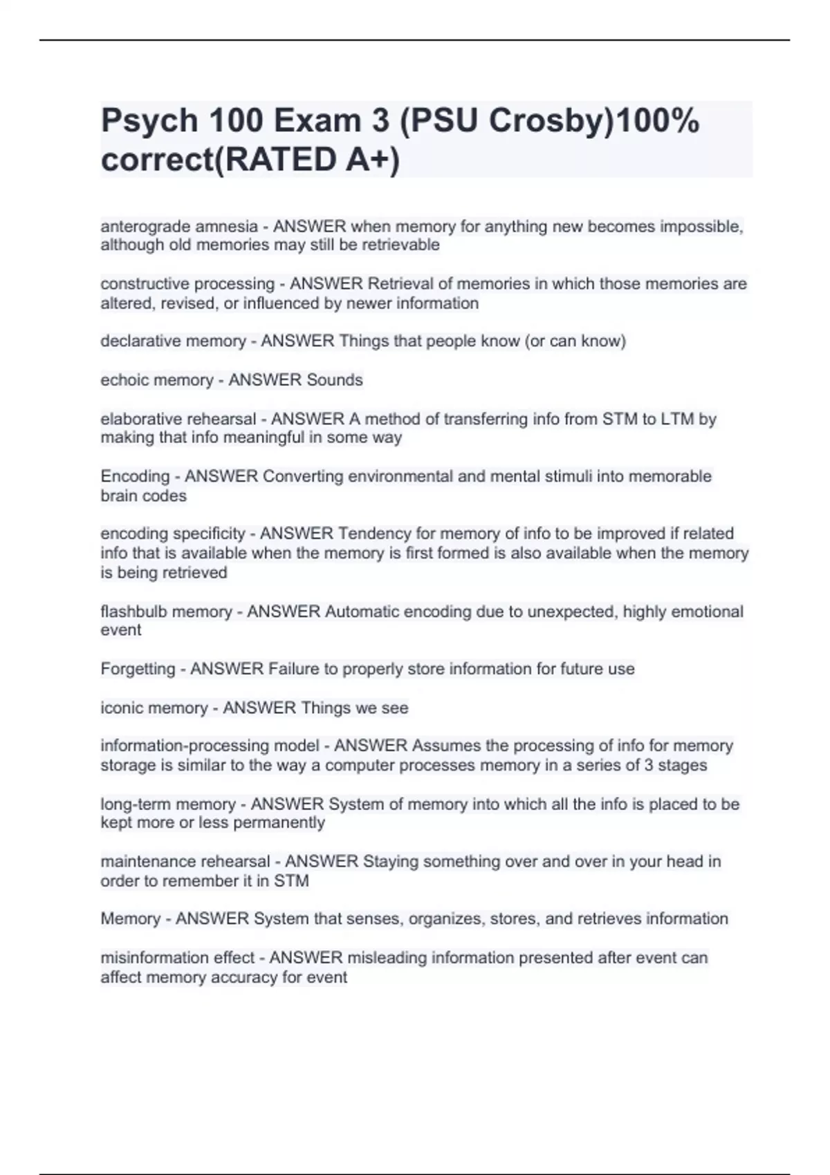 anterograde amnesia - ANSWER when memory for anything new becomes impossible, although old memories may still be retrievable constructive processing - ANSWER Retrieval of memories in which those memories are altered, revised, or influenced by newer information declarative memory - ANSWER Things that people know (or can know) echoic memory - ANSWER Sounds elaborative rehearsal - ANSWER A method of transferring info from STM to LTM by making that info meaningful in some way Encoding - ANSWER Converting environmental and mental stimuli into memorable brain codes encoding specificity - ANSWER Tendency for memory of info to be improved if related info that is available when the memory is first formed is also available when the memory is being retrieved flashbulb memory - ANSWER Automatic encoding due to unexpected, highly emotional event Forgetting - ANSWER Failure to properly store information for future use iconic memory - ANSWER Things we see information-processing model - ANSWER Assumes the processing of info for memory storage is similar to the way a computer processes memory in a series of 3 stages long-term memory - ANSWER System of memory into which all the info is placed to be kept more or less permanently maintenance rehearsal - ANSWER Staying something over and over in your head in order to remember it in STM Memory - ANSWER System that senses, organizes, stores, and retrieves information misinformation effect - ANSWER misleading information presented after event can affect